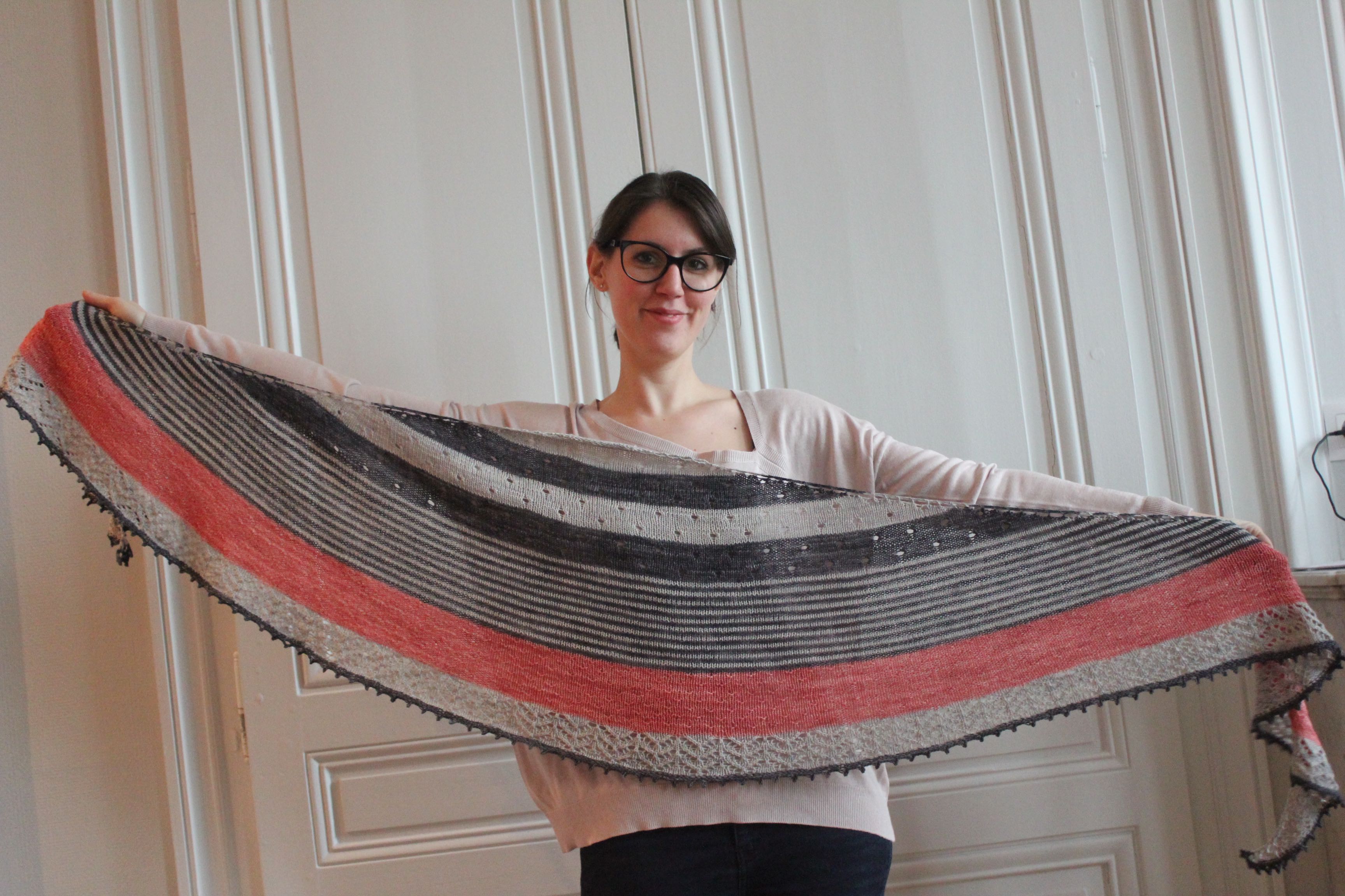 Je crois que j’ai bien fait car il en aura fallu de la motivation pour en venir à bout !! Voir les tricopines avancer, leur choix de jolies couleurs et leurs châles finis m’ont vraiment permis de ne pas (trop) me démotiver et d’arriver au bout de ce patron.