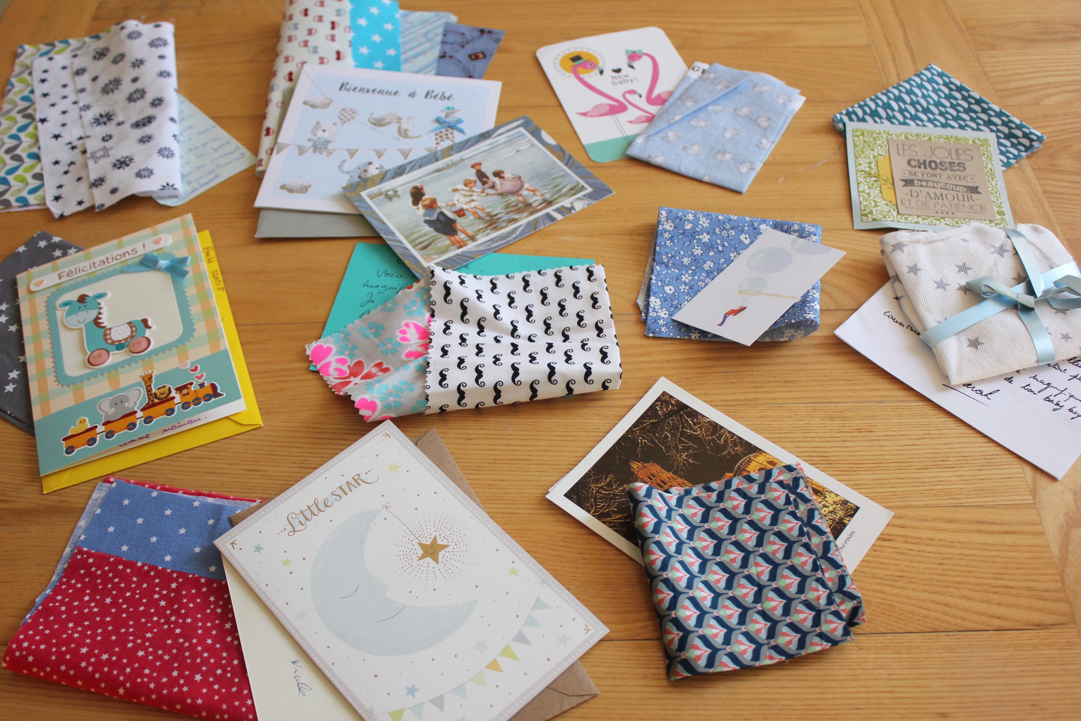 J’ai passé deux après-midi entières à faire l’inventaire de tout ce que j’ai reçu et je n’en reviens toujours pas. J’en ai le tournis quand je pense à vous toutes qui avaient pris la peine de choisir un petit coupon, le découper, sélectionner avec soin une carte et y écrire un voeux précieux pour notre bébé.