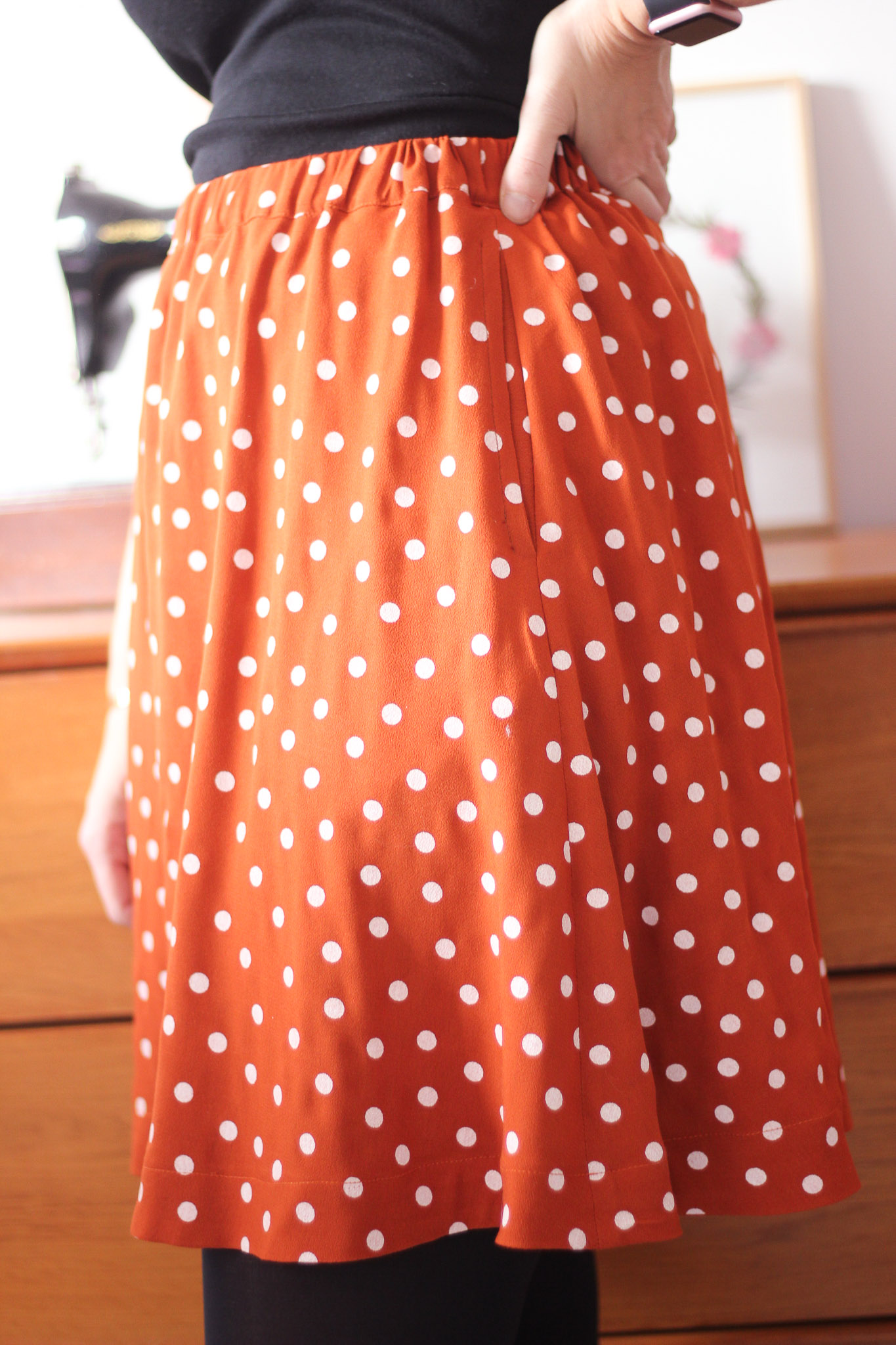 De prime abord, on peut se dire que ce n’est qu’une simple jupe élastiquée mais, croyez-moi, c’est bien plus que ça ! Pour commencer, les proportions sont parfaites : ni trop longue ni trop courte pour moi (sachant que je n’ai rien modifié). La ceinture a la taille a pile la bonne ampleur d’élasticité pour qu’il n’y ait pas de surplus de matière. C’est très souvent le cas sur les patrons de jupe élastiquée et c’est très disgracieux selon moi. Les poches sont parfaitement positionnées.