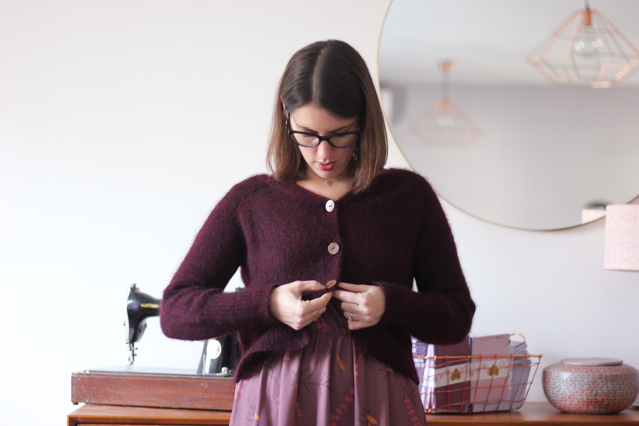 moi je trouve l’association des coloris tissu et laine juste magnifique! je trouve ça doux et délicat, plein de nuance… j’ai l’impression d’un petit cocon tout doux … cela vous va très bien… le seul petit bemol la jupe parait courte mais quand on a de jolies jambes … bonne journée et encore bravo pour tes tissus.