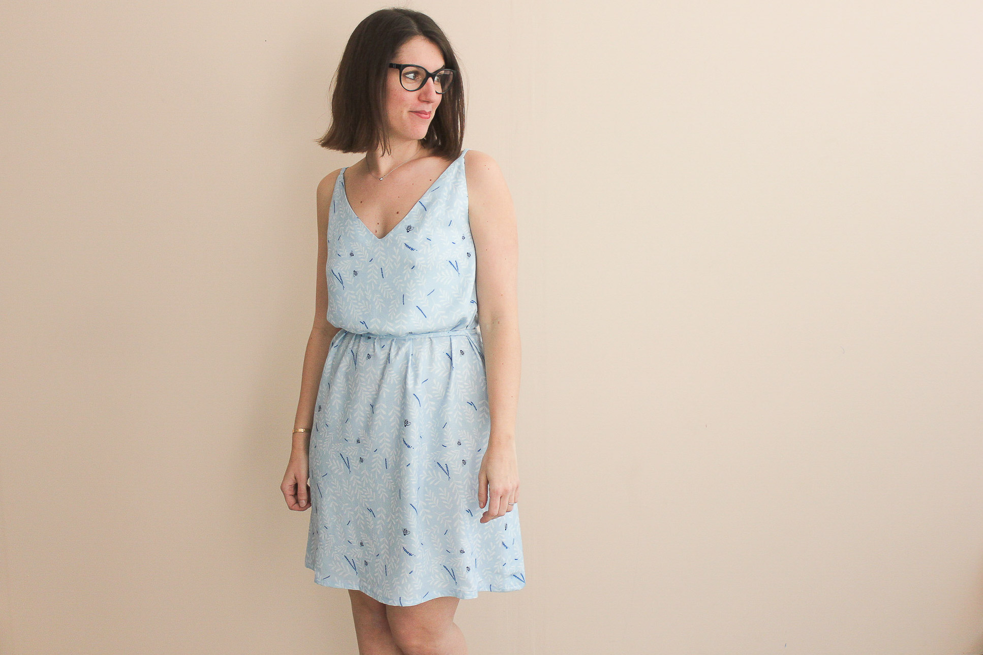 J’ai utilisé le crêpe de viscose Busy bee en version bleu issu de ma dernière collection. C’est un tissu délicat et estival qui, je trouve, va très bien à Pensée. Il se coud facilement, n’est pas transparent et a un très joli tombé.