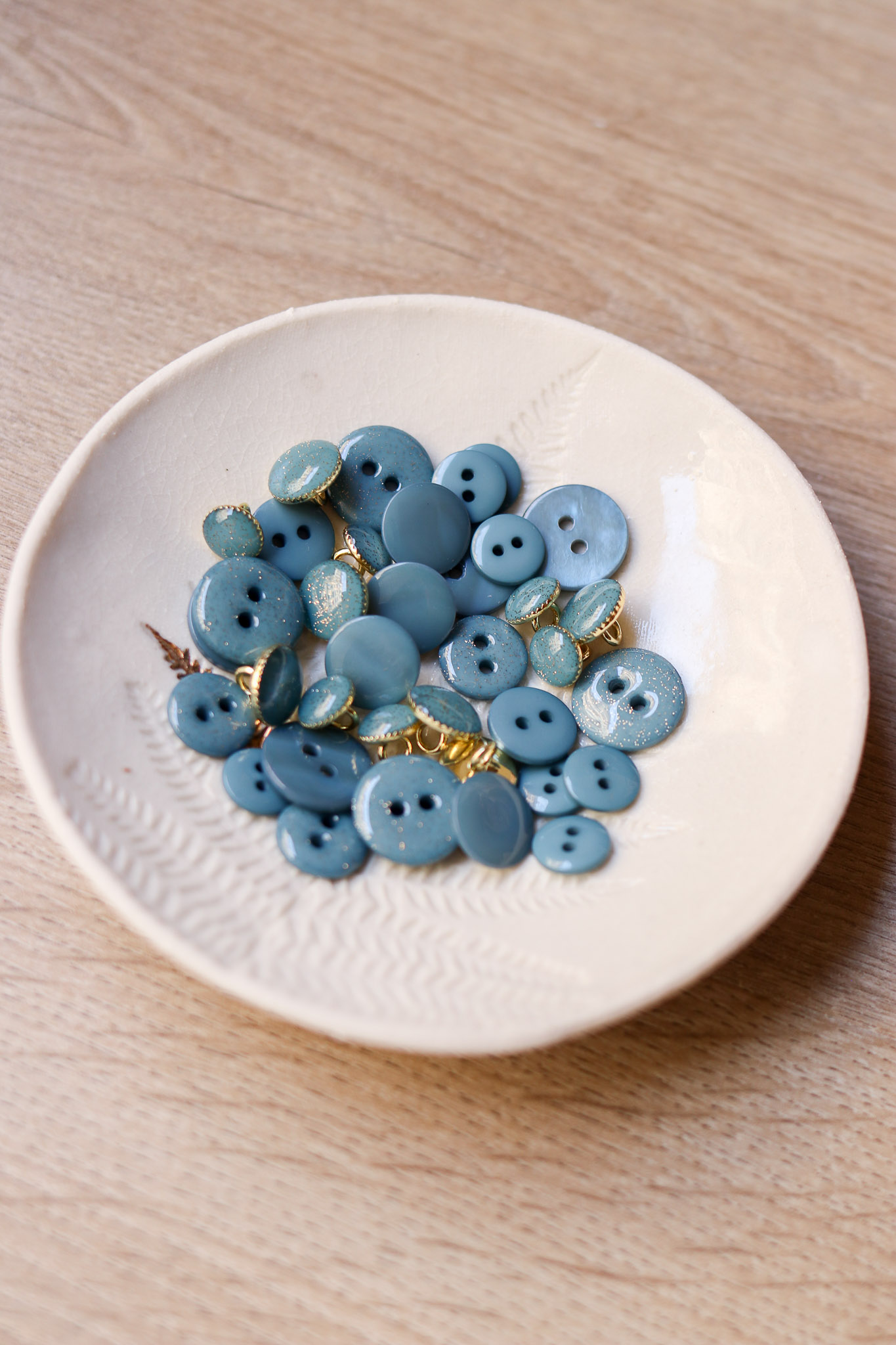 Une seizième couleur vient compléter notre arc-en-ciel de boutons : orage, un gris bleu intense. On est sous le charme de cette couleur lumineuse et intense.