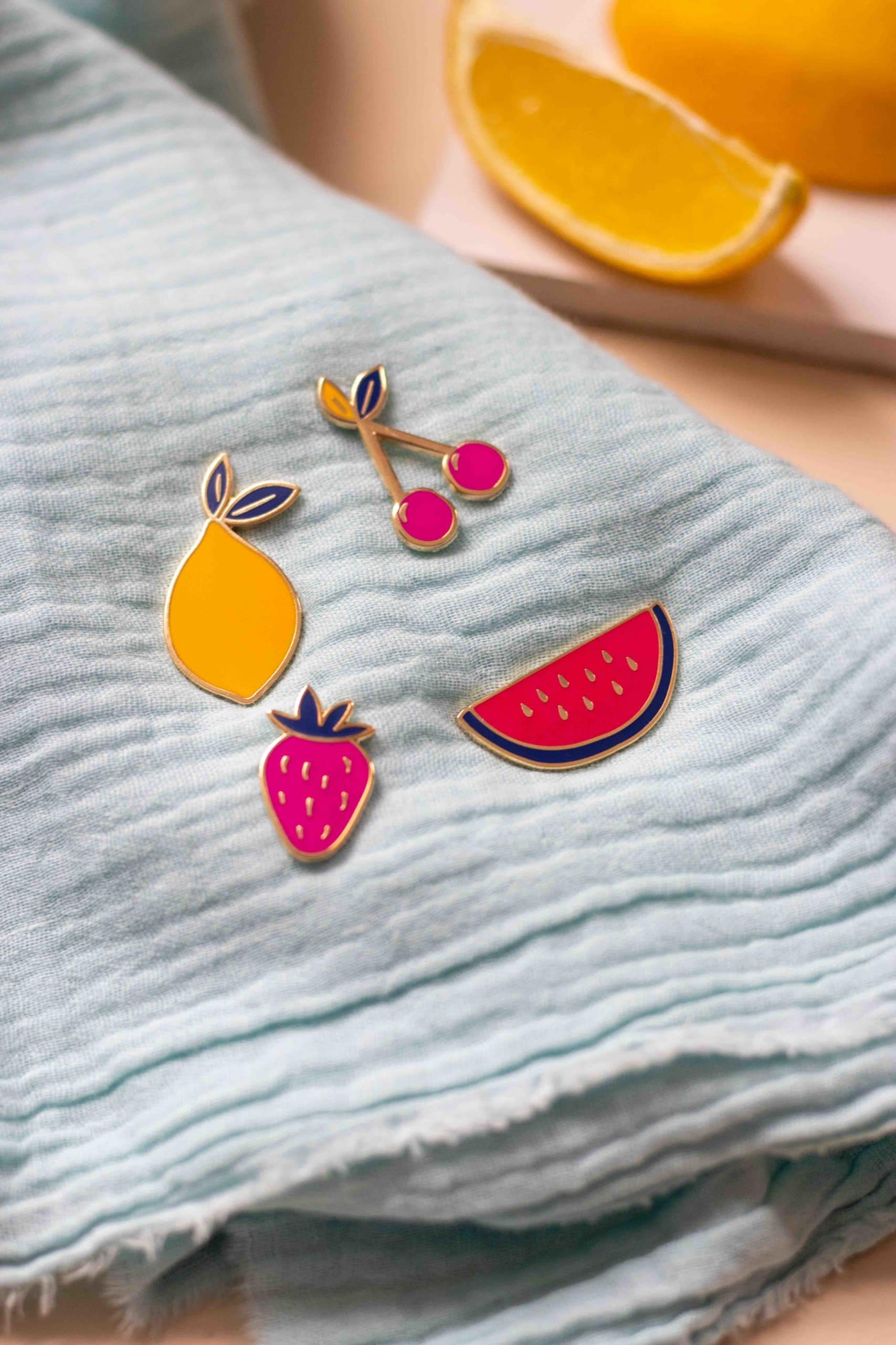 Amusez-vous à faire un petit clin d’œil à la doublure de votre sac ou à ajouter du pep à vos tenues en y ajoutant nos pin’s petits fruits. Ils seront présentés sous forme d’un set comprenant 2 pin’s (fraise et cerise) et 2 porte-aiguilles aimantés (citron et pastèque). Conçu pour préserver les ouvrages et les vêtements, ils sont finis par un double fermoir en gomme rose.