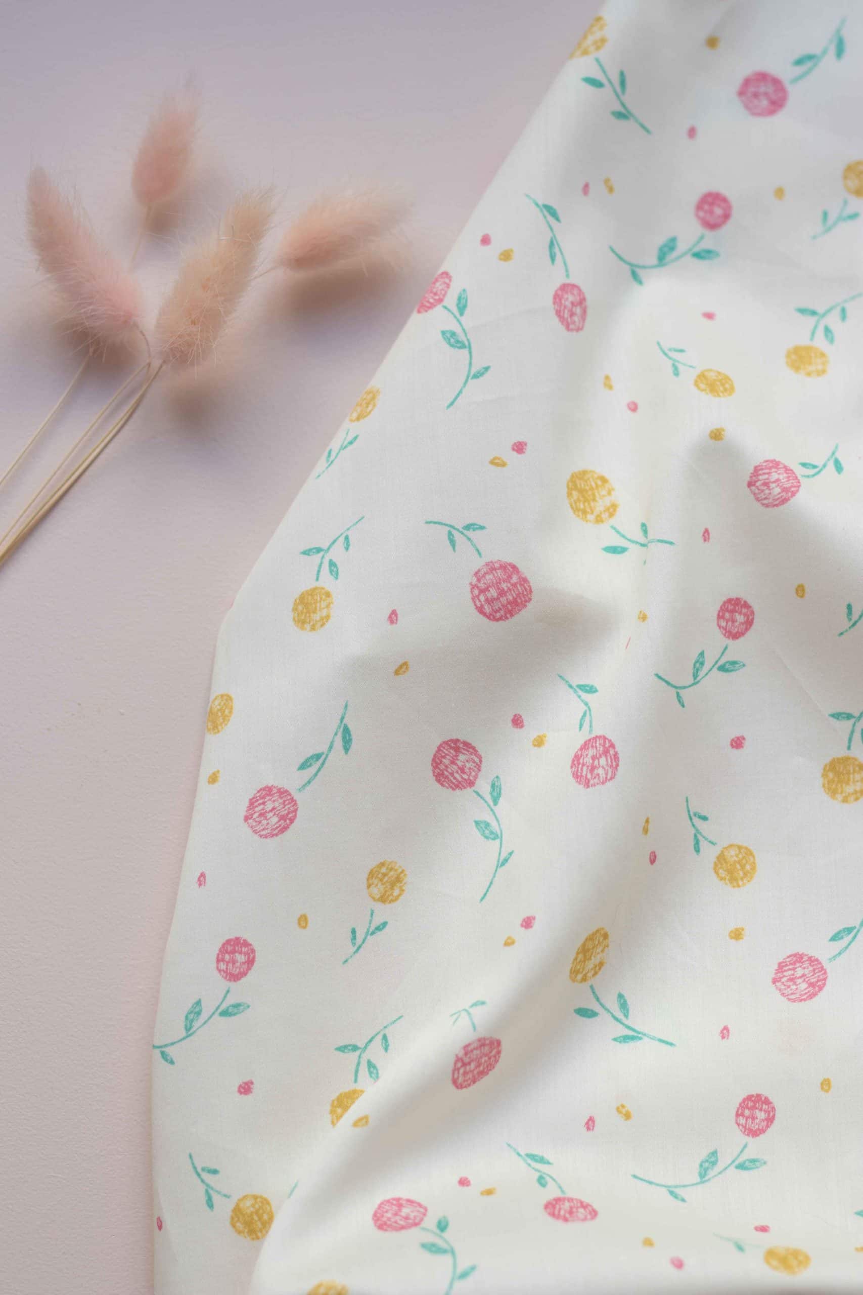 Si vous aimez nos viscoses alors vous adorerez notre satin de coton. Respirant, souple et incroyablement doux, il autorise cependant les fronces et les volants pour des créations empreintes de légèreté. C’est notre motif Flore qui inaugure cette nouvelle étoffe avec son dessin léger et estival. Conçu dans un souci de cohérence avec le reste de la collection, on retrouve l’ocre et le rose avec une touche de verdure. A la fois dynamique et délicat, les couleurs vives sont tempérées par un effet légèrement estompé pour un tissu aussi doux au toucher que dans son design.