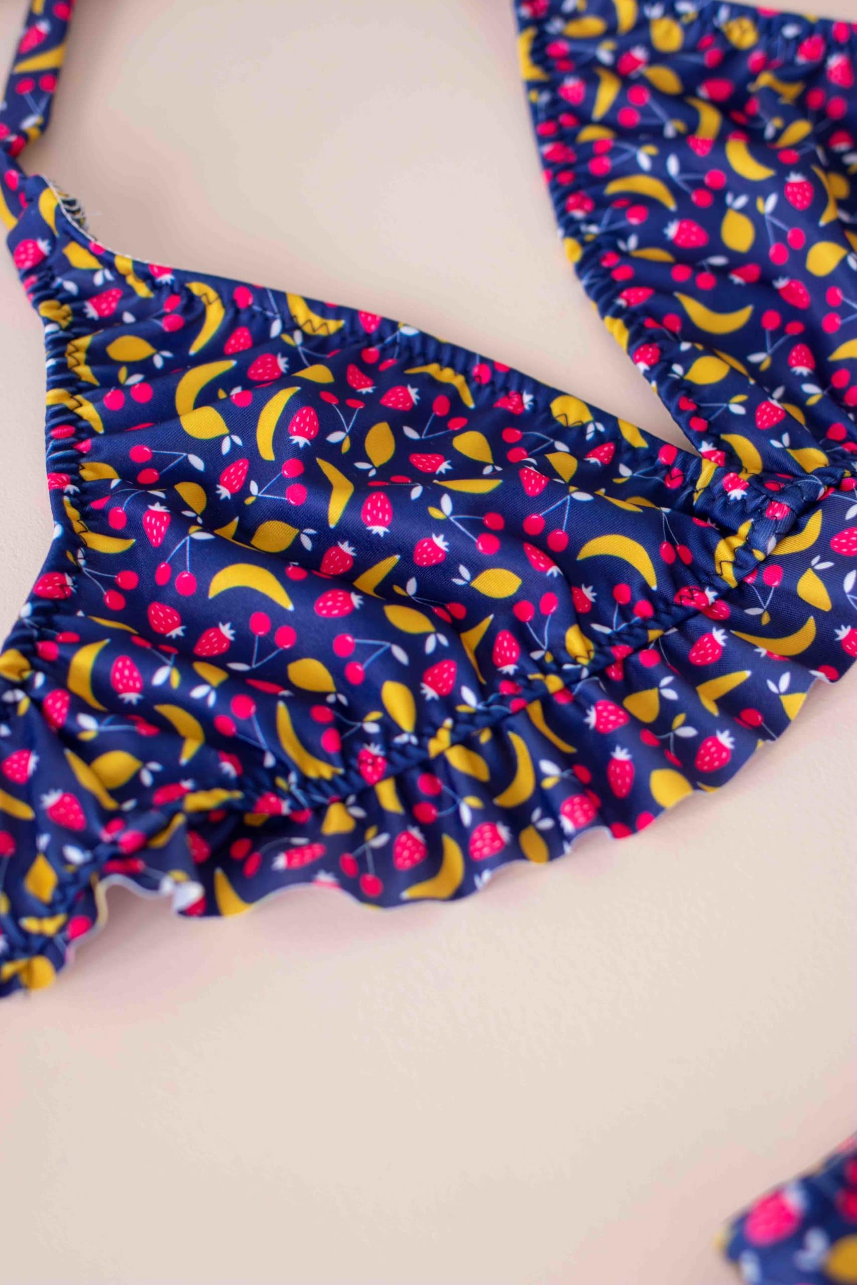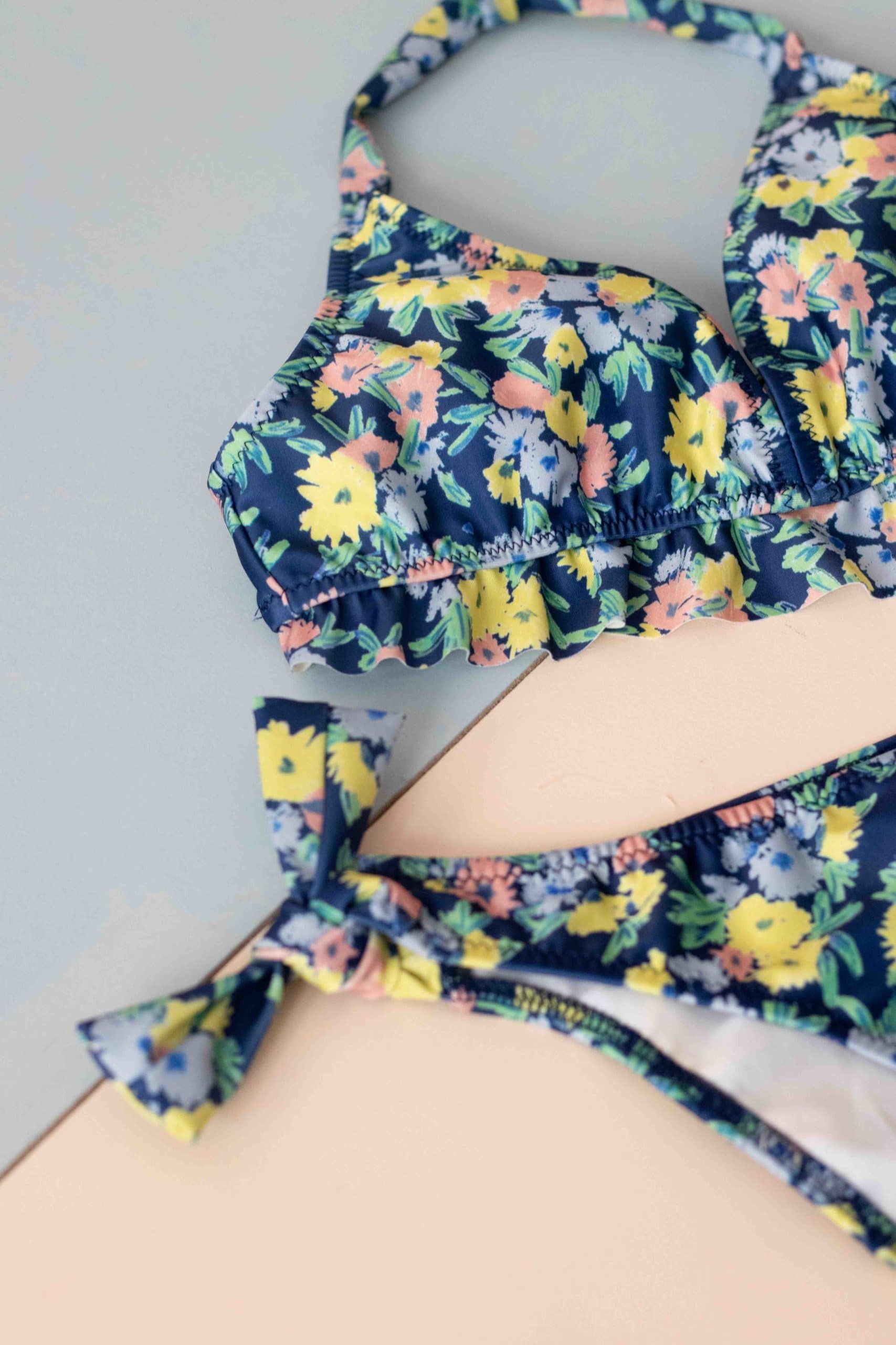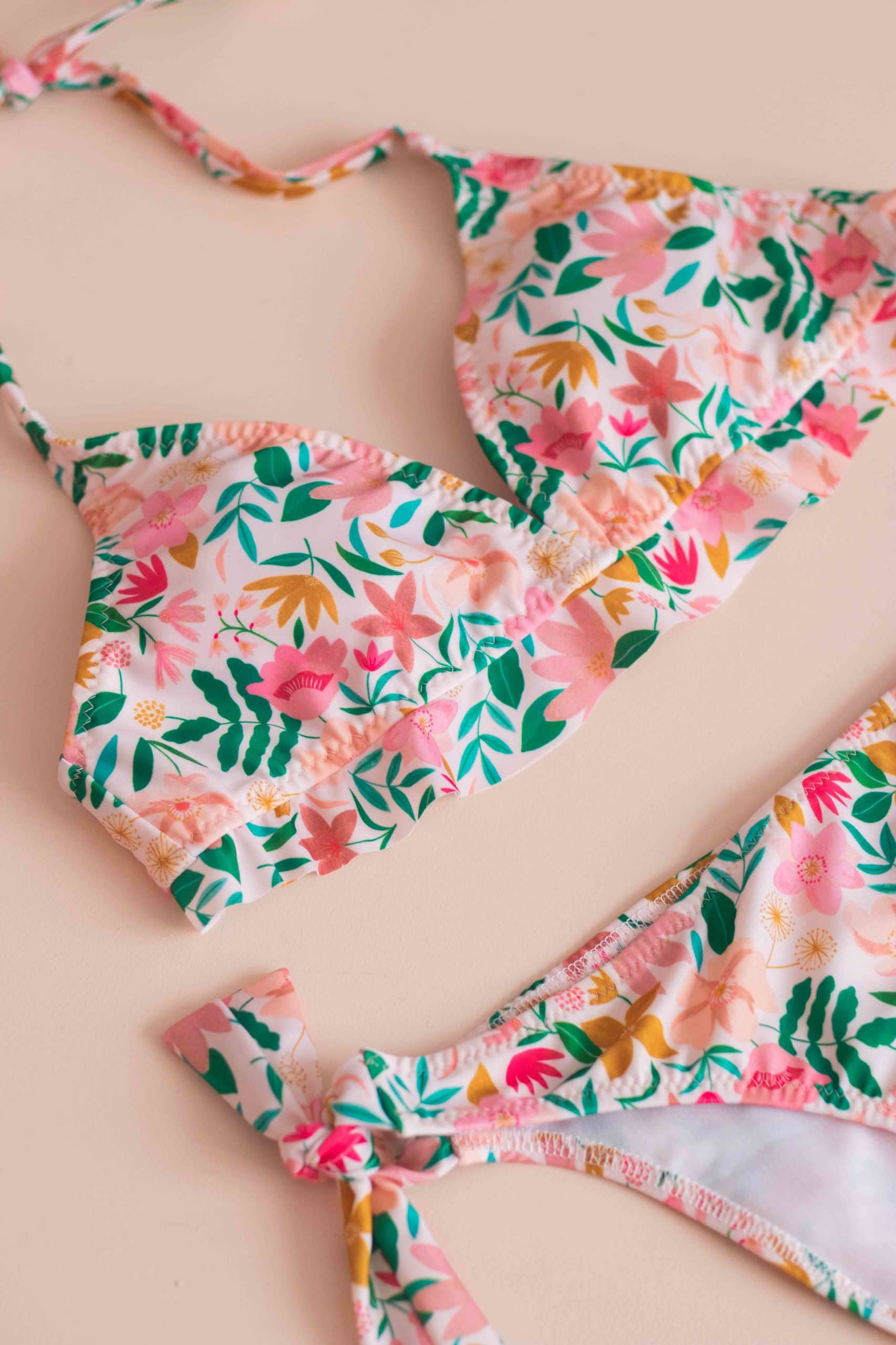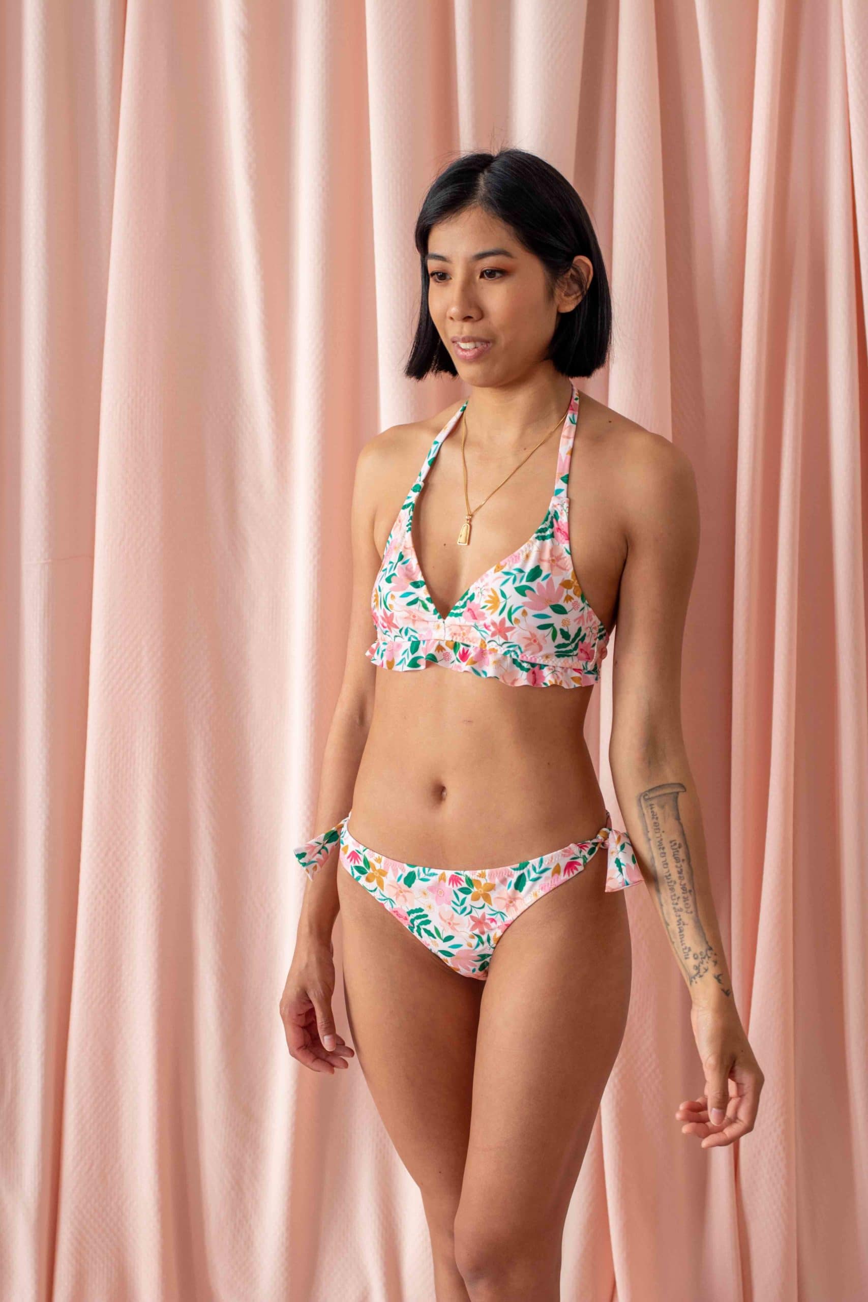 Hello Sunshine est un joli maillot de bain deux pièces. Il se compose d’un haut en forme de triangle à nouer, avec deux options de bas possibles : une version échancrée nouée sur les hanches et une seconde un peu plus couvrante habillée d’un volant !