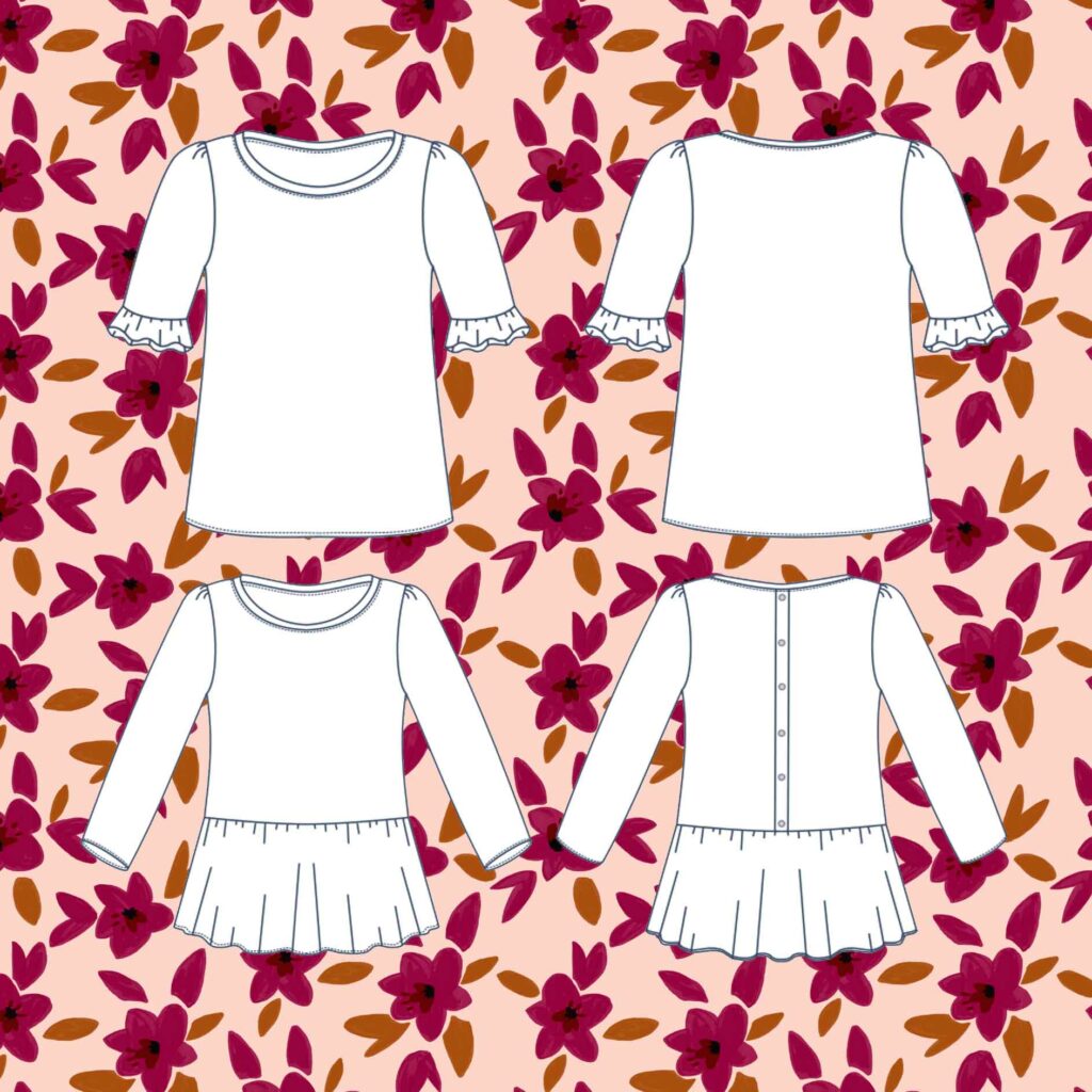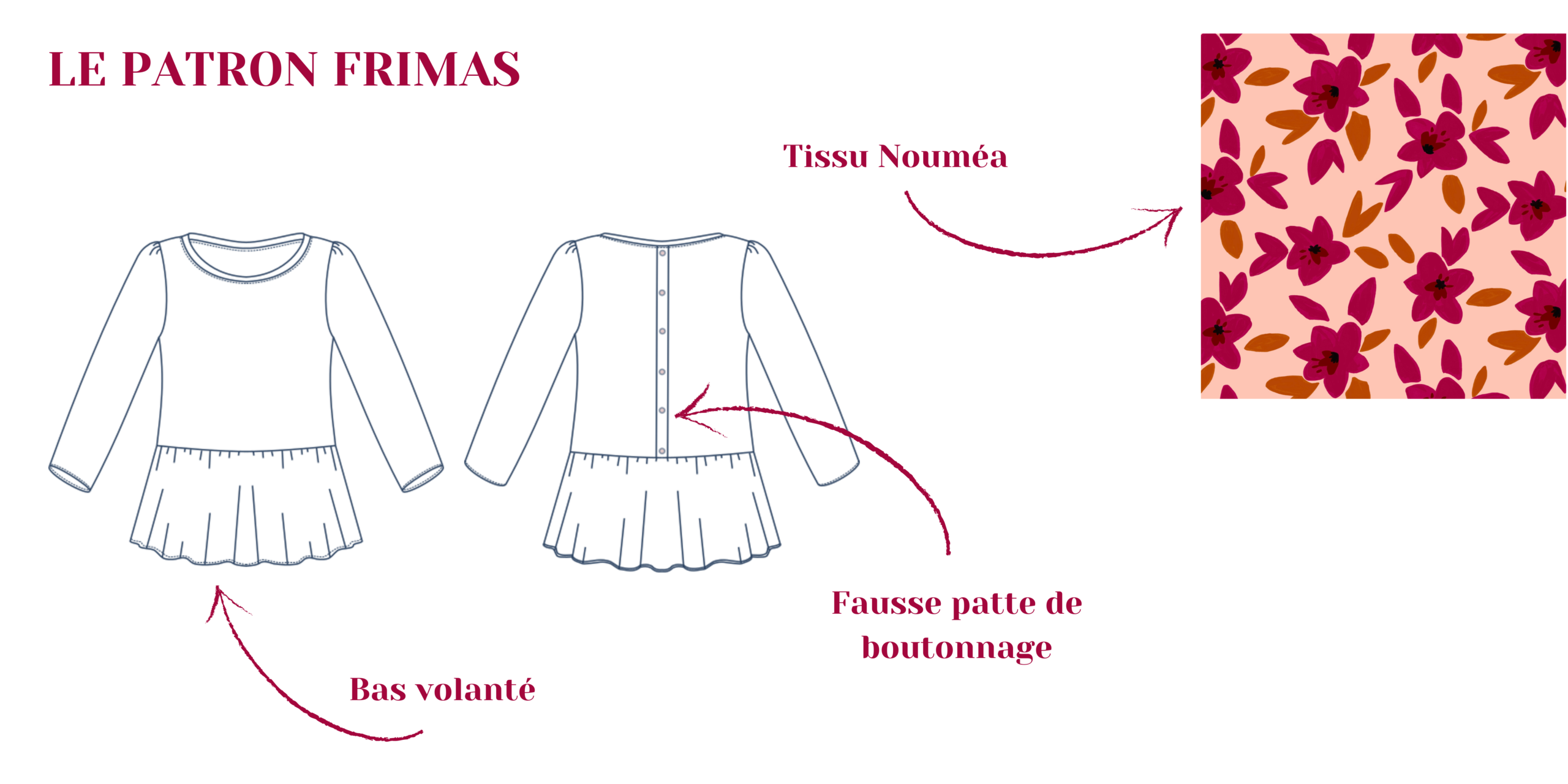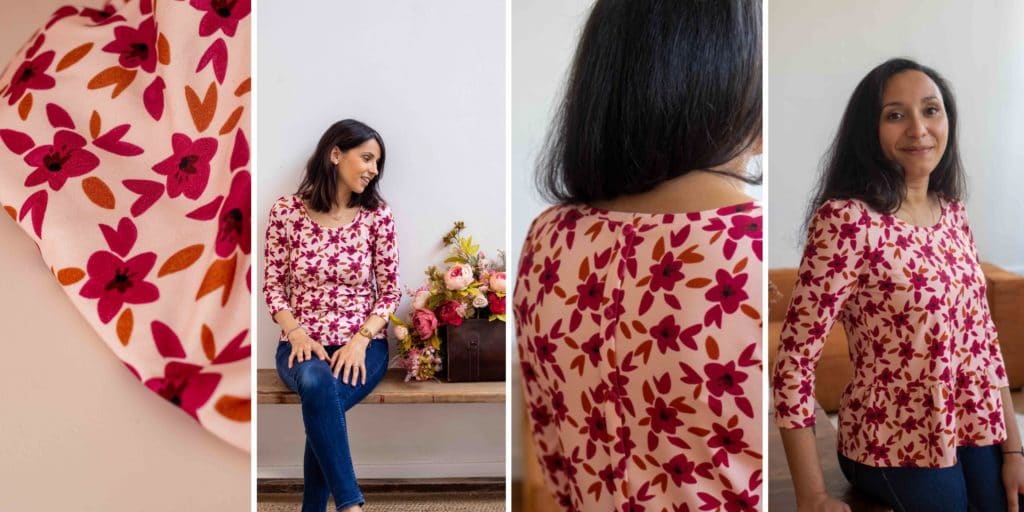 En effet, il n’est pas aisé de réaliser des boutonnières ou des fronces sur du jersey. C’est pourquoi nous avons pensé à une fausse patte de boutonnage qui vous surprendra par sa facilité (une seule couture suffit, vous y croyez ?). De même pour l’option basque et pour les volants des manches, nous étions inquiètes à l’idée que des fronces classiques ne déforment le tissu et que le rendu ne soit pas très esthétique. Nous avons donc choisi une autre méthode afin de réaliser les fronces avec du framilastic. Après quelques essais, nous étions enthousiasmées par le résultat !