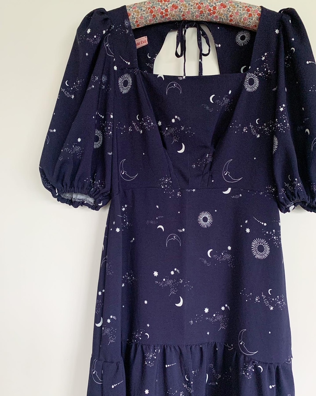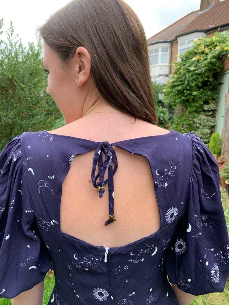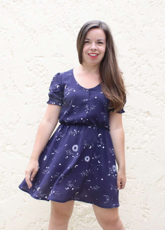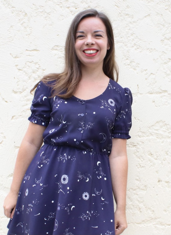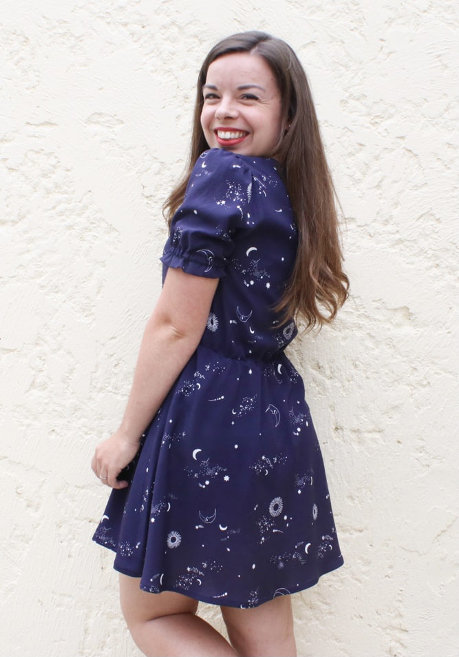 « J’ai choisi le tissu Comete car j’aimais les étoiles et les lunes associées à un fond marine classique. Le tissu a un joli drapé et il était vraiment facile à travailler avec une aiguille microtex. J’ai choisi de faire la robe Closet Core Pauline car elle a plein de détails subtils tout comme le tissu. Les fronces sur la jupe s’accordaient parfaitement avec le tissu et j’ai ajouté de petites perles étoilées aux liens à l’arrière pour le fun. Je prévois de la porter en hiver avec des bottes ou je pourrais la porter avec des talons dorés. »