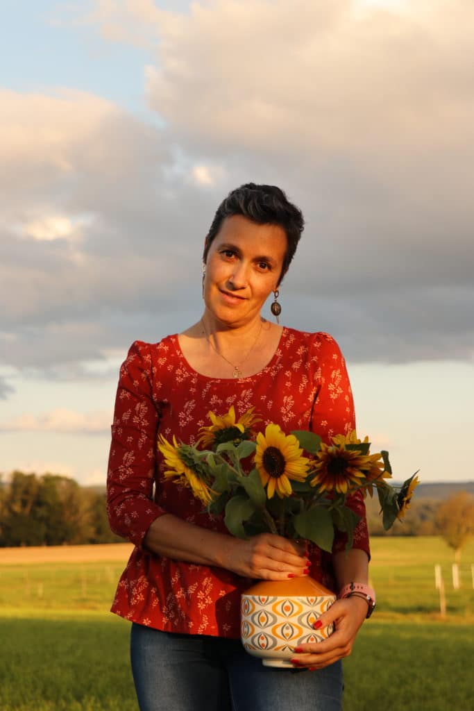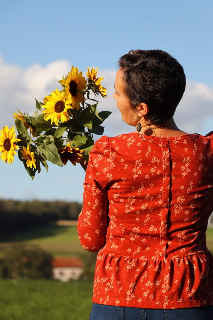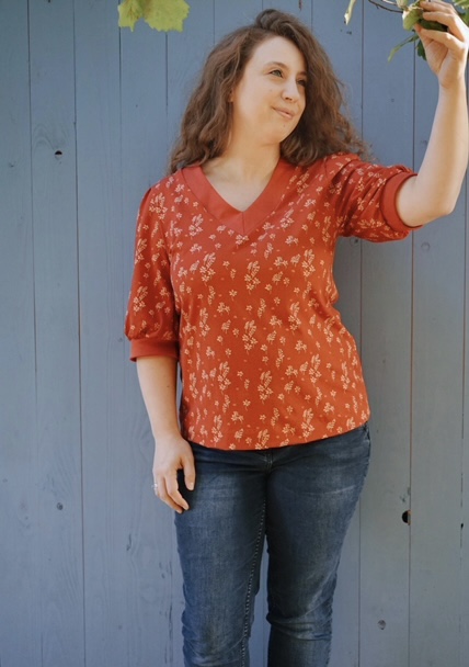 « J’ai été amoureuse de ce modèle déjà en été avec la viscose » Brise d’été « . Quand j’ai vu la nouvelle couleur pour l’automne, c’était sûr que je devais coudre celle-là aussi ! Le jersey est d’une grande qualité, les couleurs sont vives et belles. J’ai choisi un modèle de chemise comme basique dans ma garde-robe car je veux porter ce modèle très souvent. »
