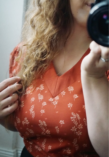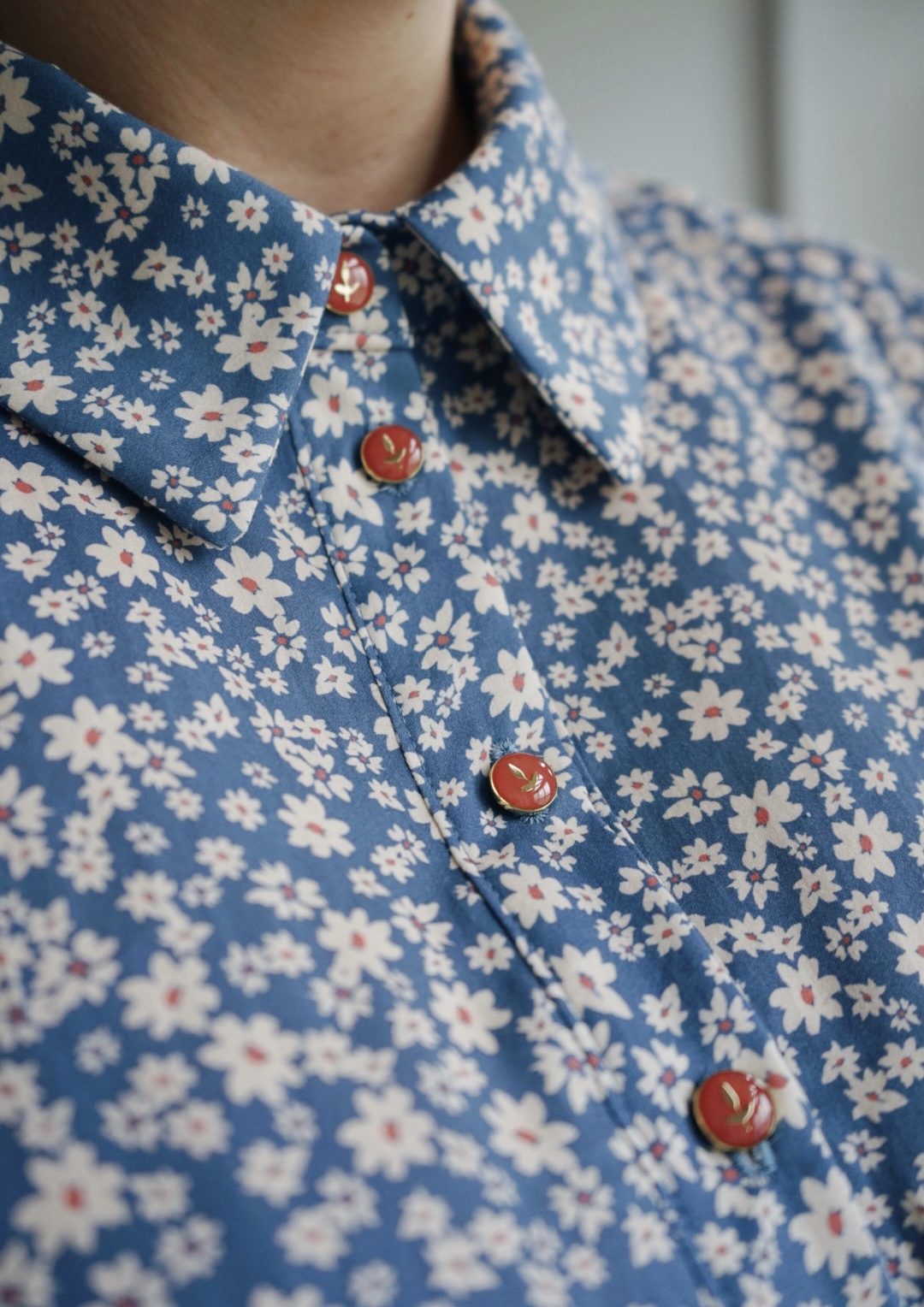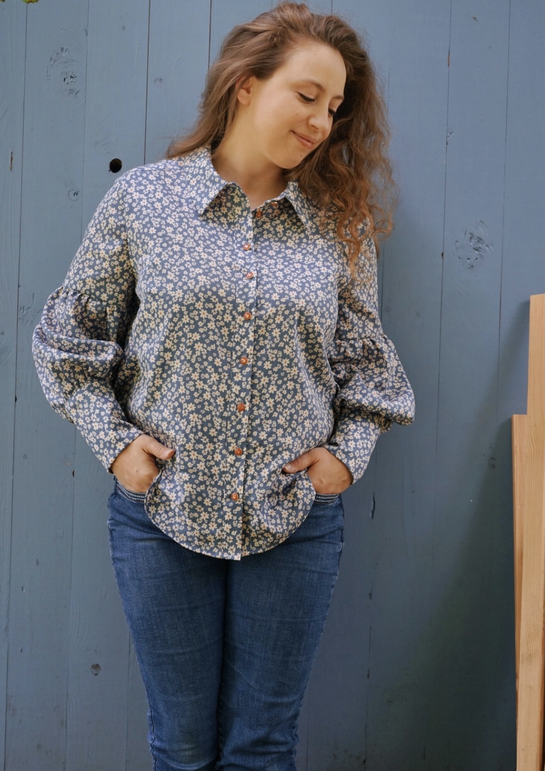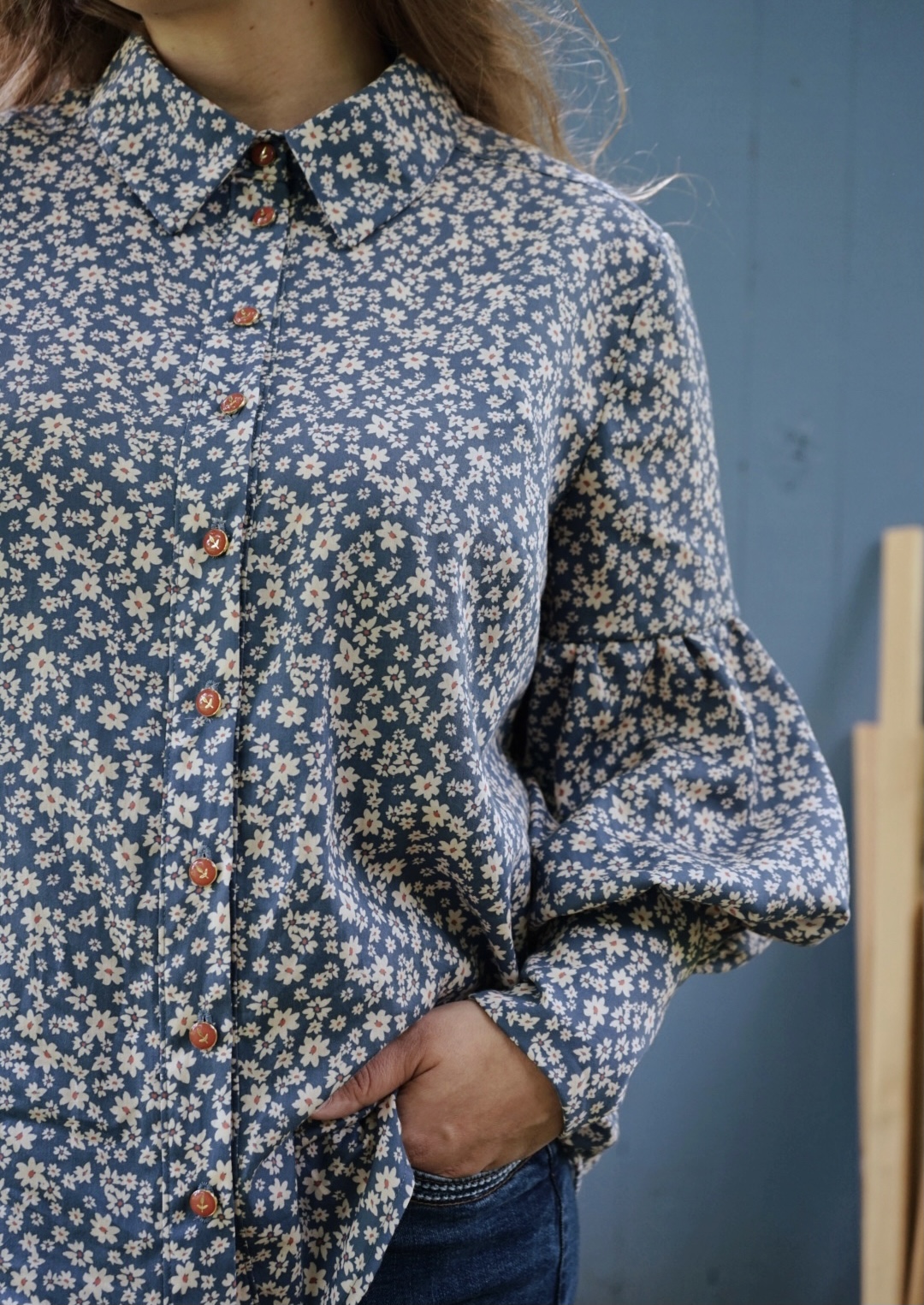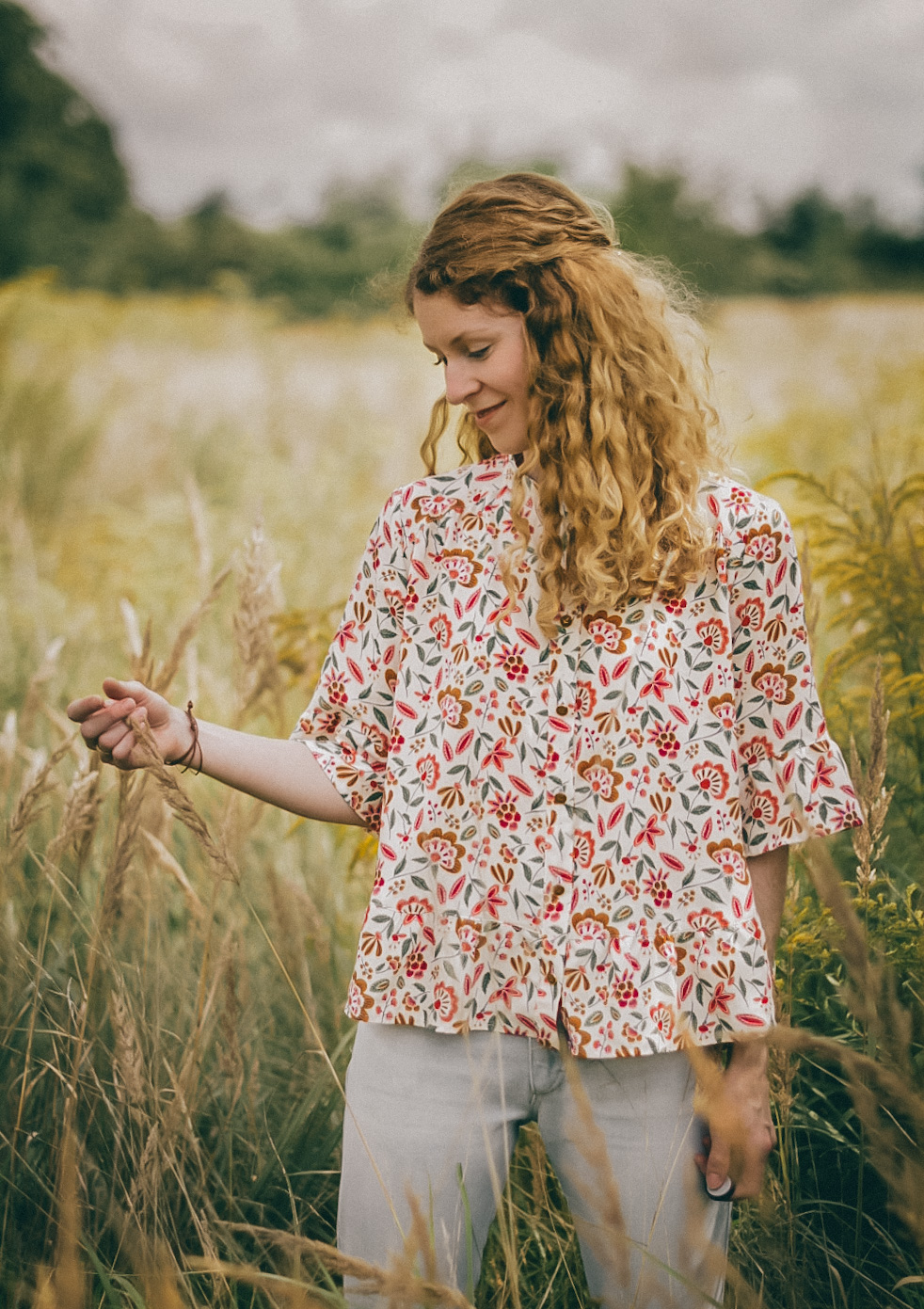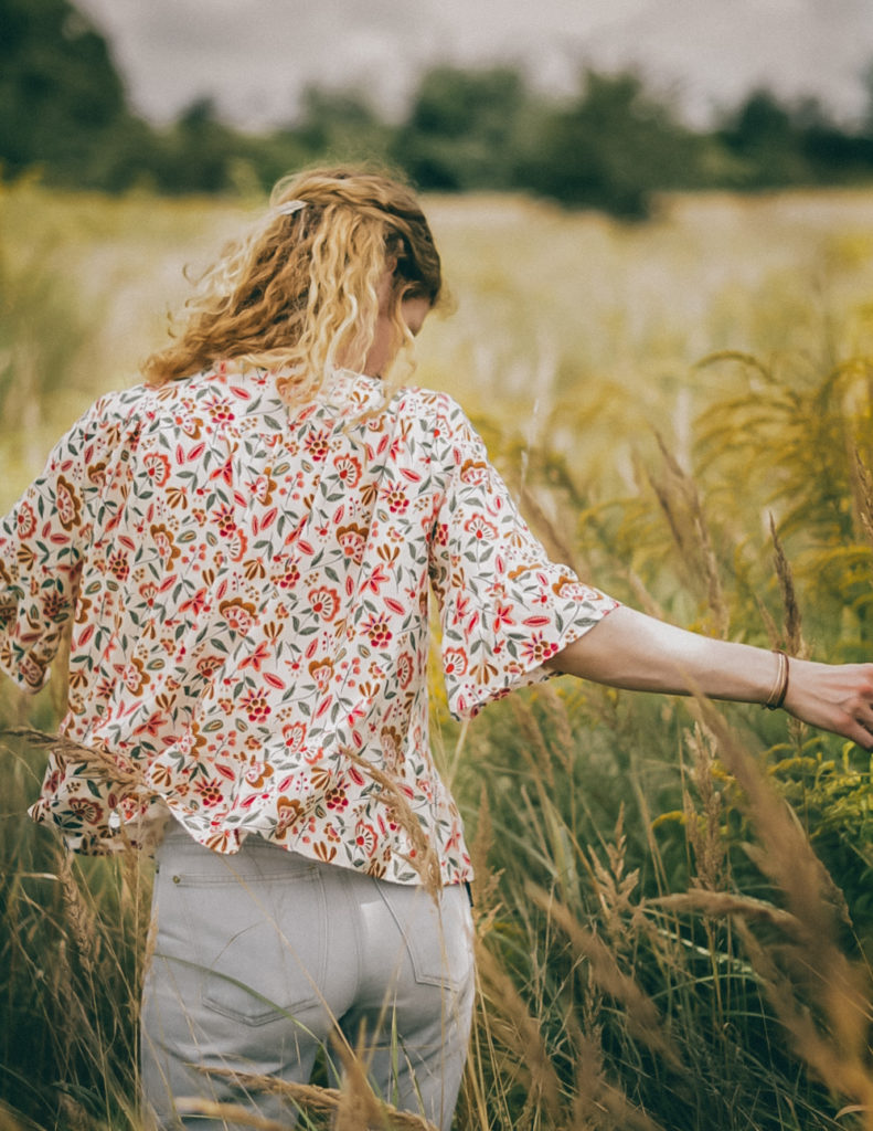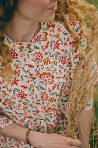» J’ai choisi Olga car j’adore les combinaisons de couleurs ainsi que le motif floral, qui a clairement une touche slave. J’avais vraiment envie de faire un chemisier car je suis aussi tombée amoureuse de vos jolis boutons, alors Flore de République du Chiffon m’est venu à l’esprit, car il a une sorte de style bohème romantique qu’Olga a aussi. »