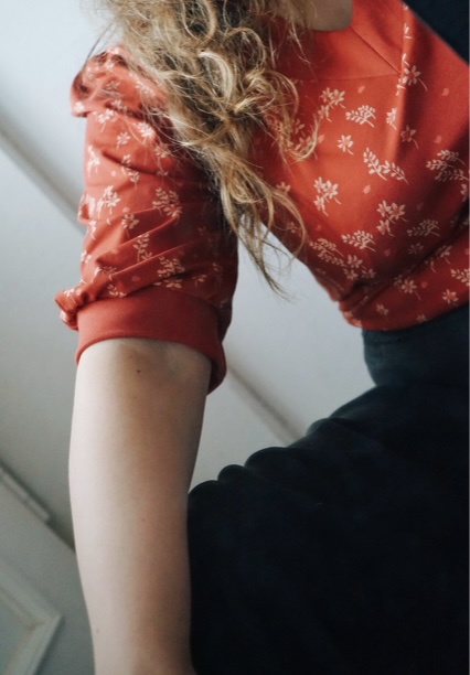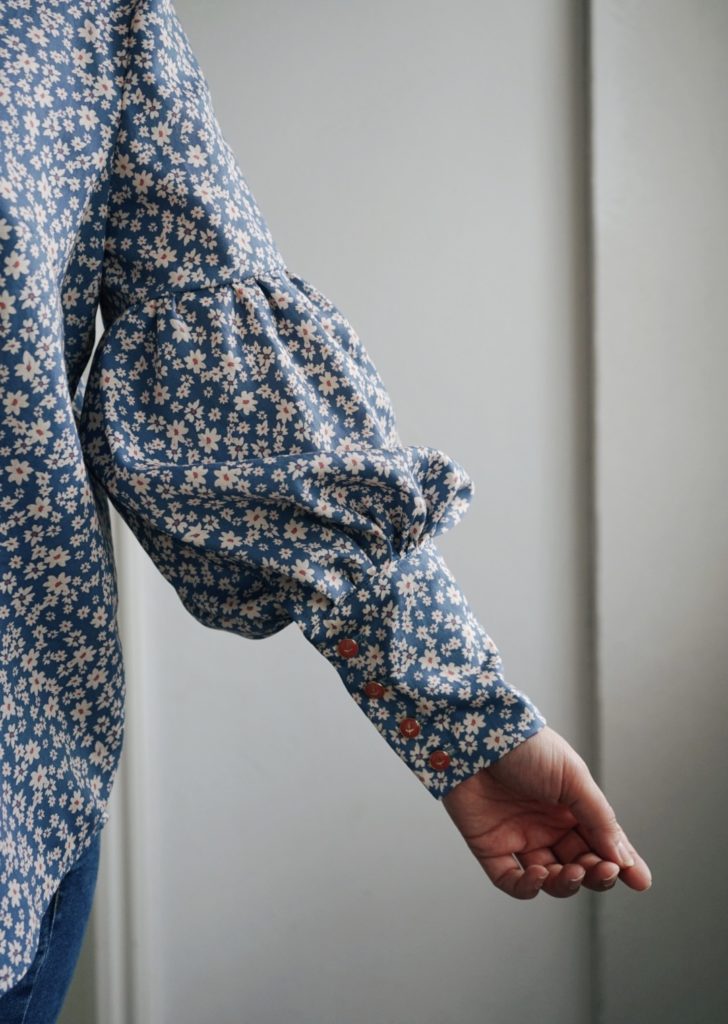 « Ce tissu est si doux ! Une merveilleuse qualité de satin de coton et j’adore ces petites fleurs dans cette belle couleur blush. J’ai décidé de coudre une blouse avec des manches impressionnantes, le drapé du tissu est juste parfait pour cela. »