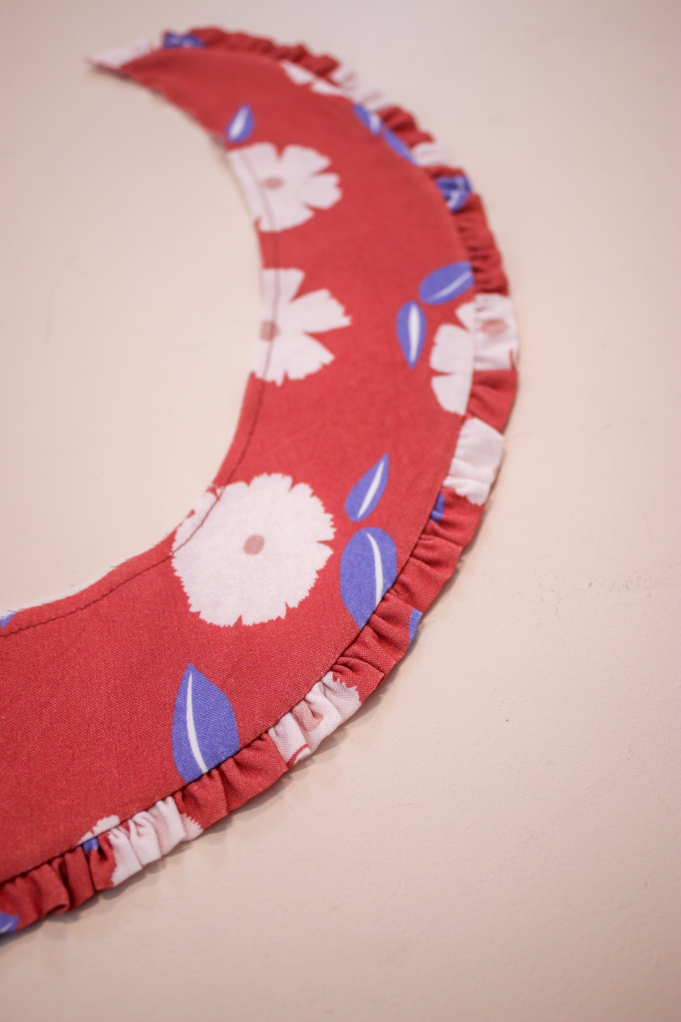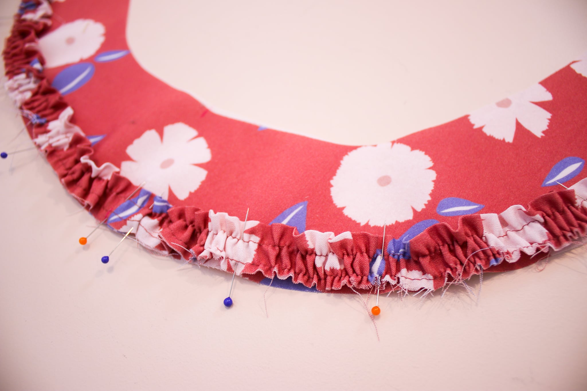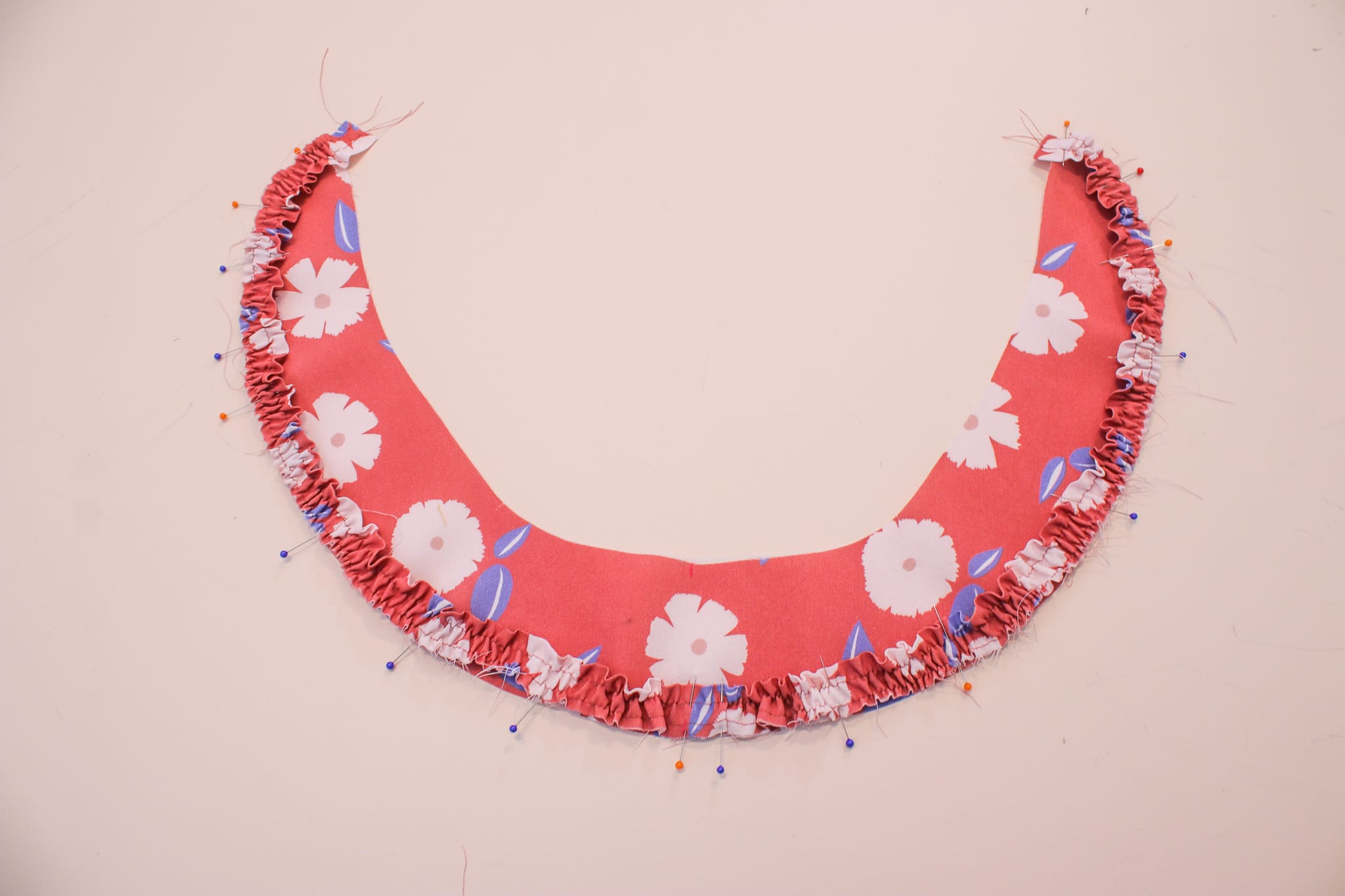 - Répartissez soigneusement les fronces et épinglez la bande froncée sur le dessous de col. Réalisez une couture à 7mm du bord pour maintenir le tout en place.