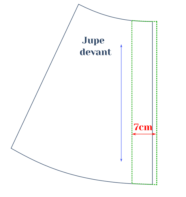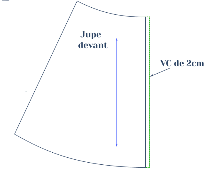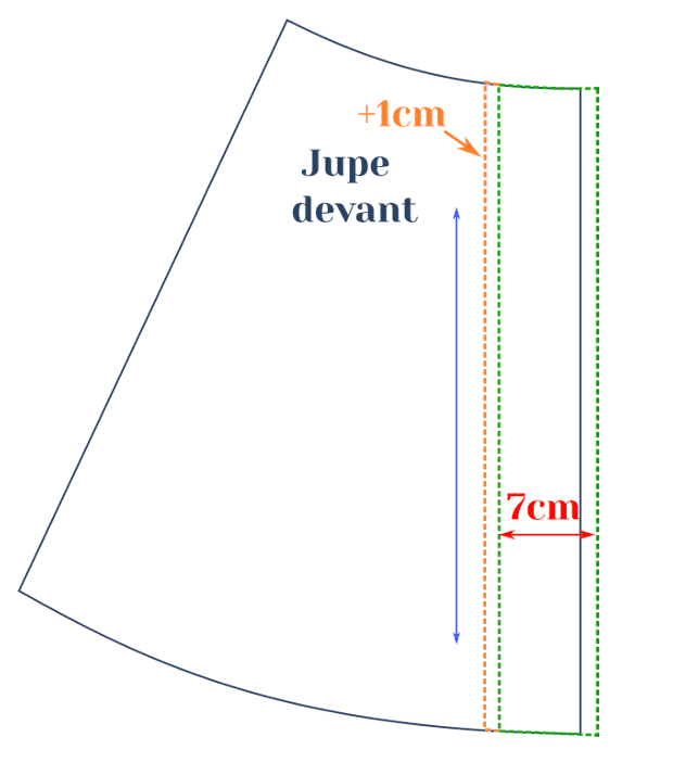 Au milieu devant, ajoutez la valeur de couture de 1cm + la valeur de superposition de 1cm sur toute la hauteur de la pièce (en vert sur le schéma), donc 2cm au total.