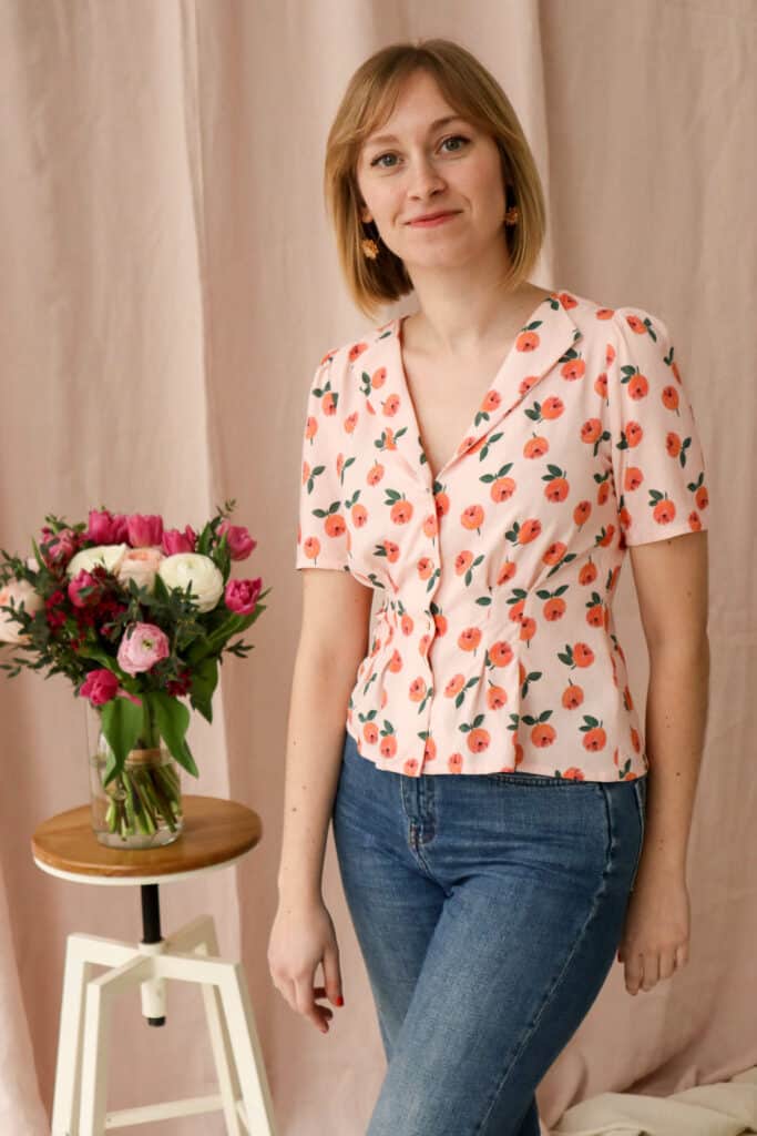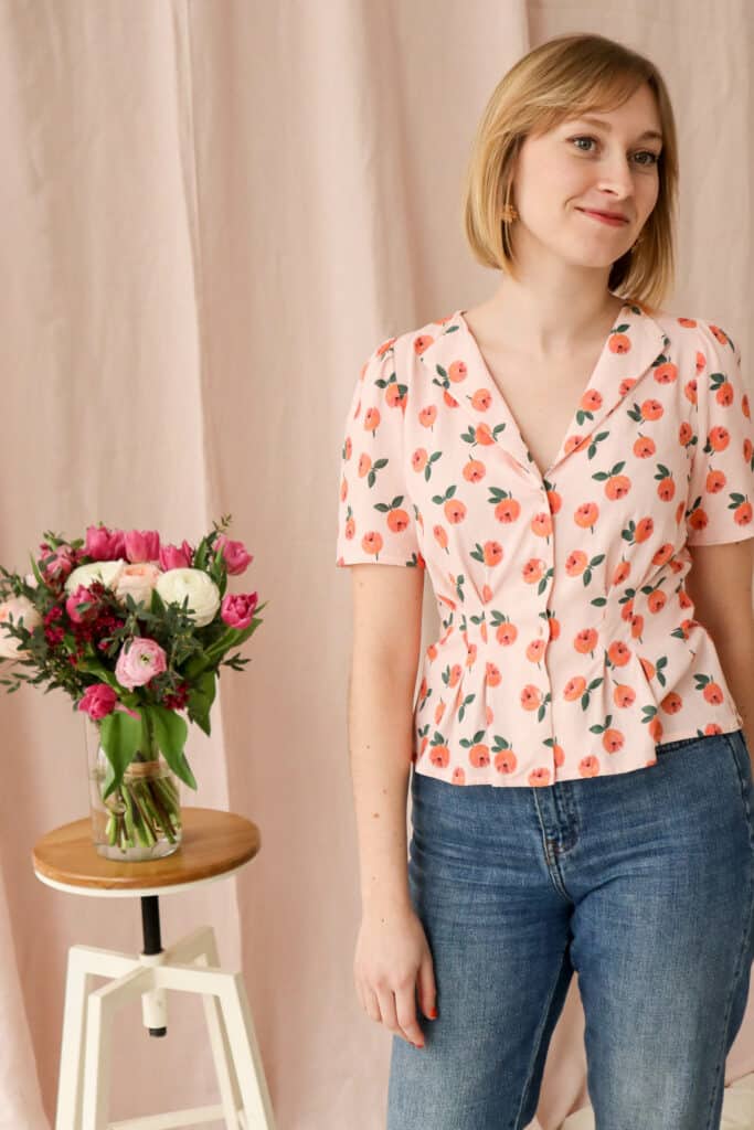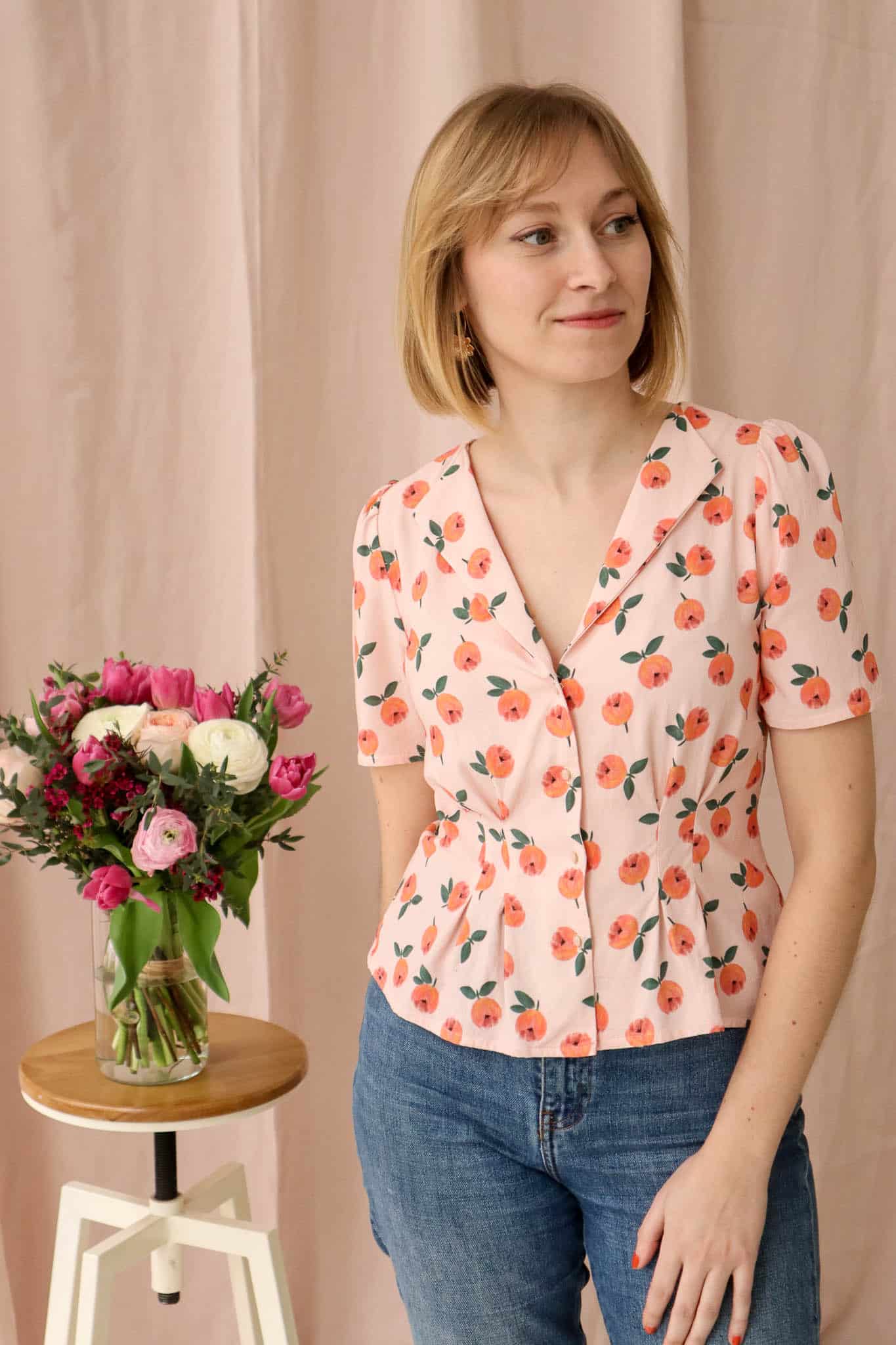Ici, Lise D porte la version blouse de Gigi, avec l’option col rabattu. Elle a cousu les manches de la blouse Rêverie et n’a rencontré aucune difficulté de patronage. Elle a tout de même opté pour la taille 36, au lieu de son 34 habituel.