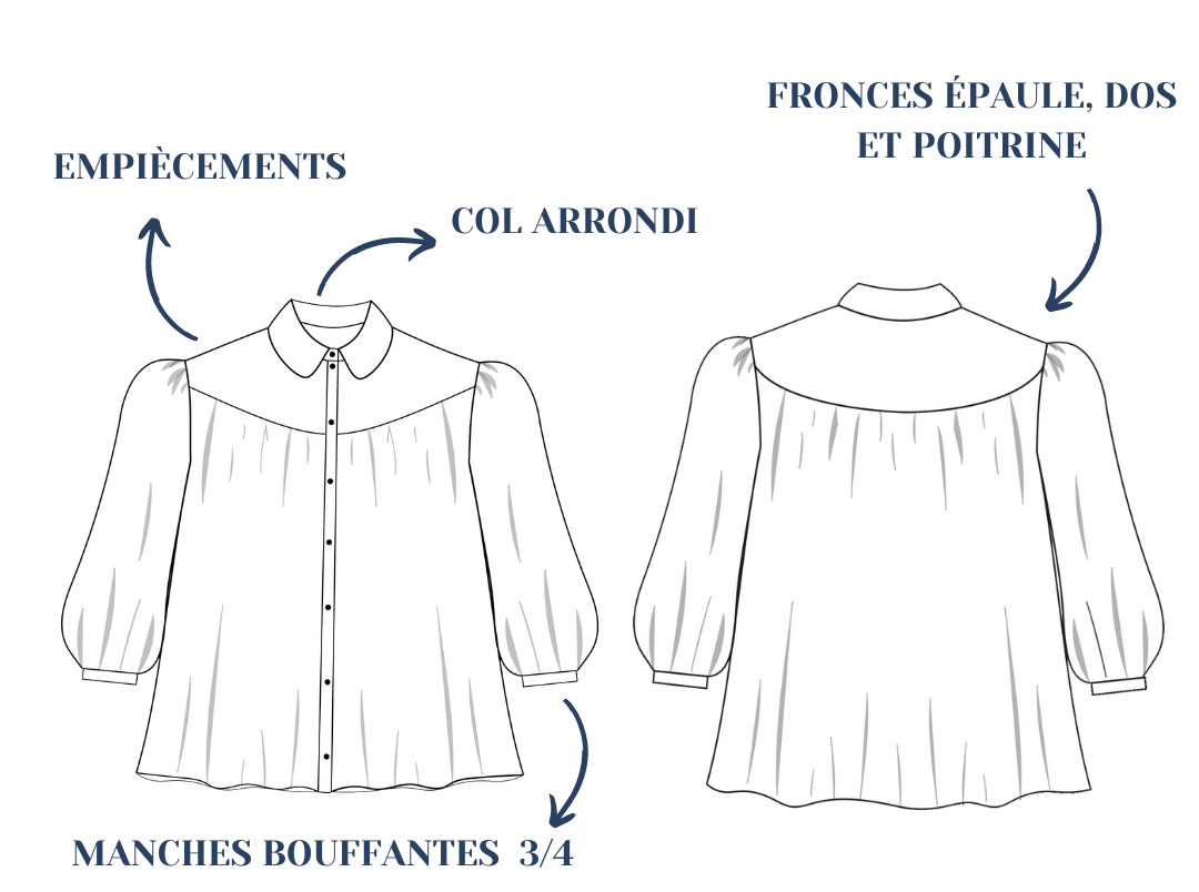 Pimpante est la chemise classique revisitée par Lise Tailor. Les empiècements sur le devant et le dos mettent en valeur le joli jeu de volumes.