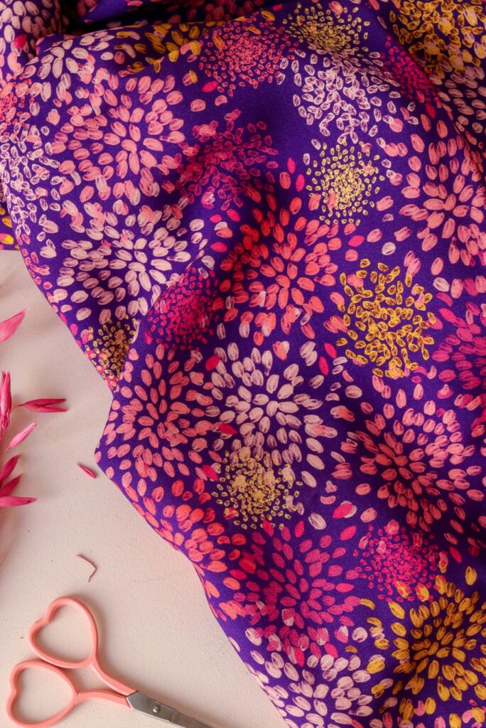 Nos chaudes journées d’été se terminent en grande fête sous les crépitements des feux d’artifices hebdomadaires des bords de mer. Artifice, un motif plein de mouvement où de multiples touches viennent éclater de façon circulaire pour émerveiller vos tenues. Sur un fond violet à l’image de la couleur du ciel à la tombée de la nuit, le spectacle se forme grâce à une palette de rose qui va du plus clair à l’intensité du fuchsia, en passant par des notes de corail.
