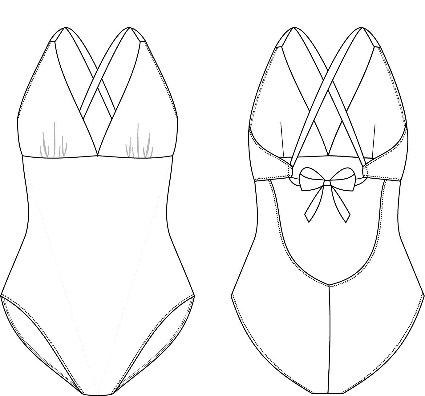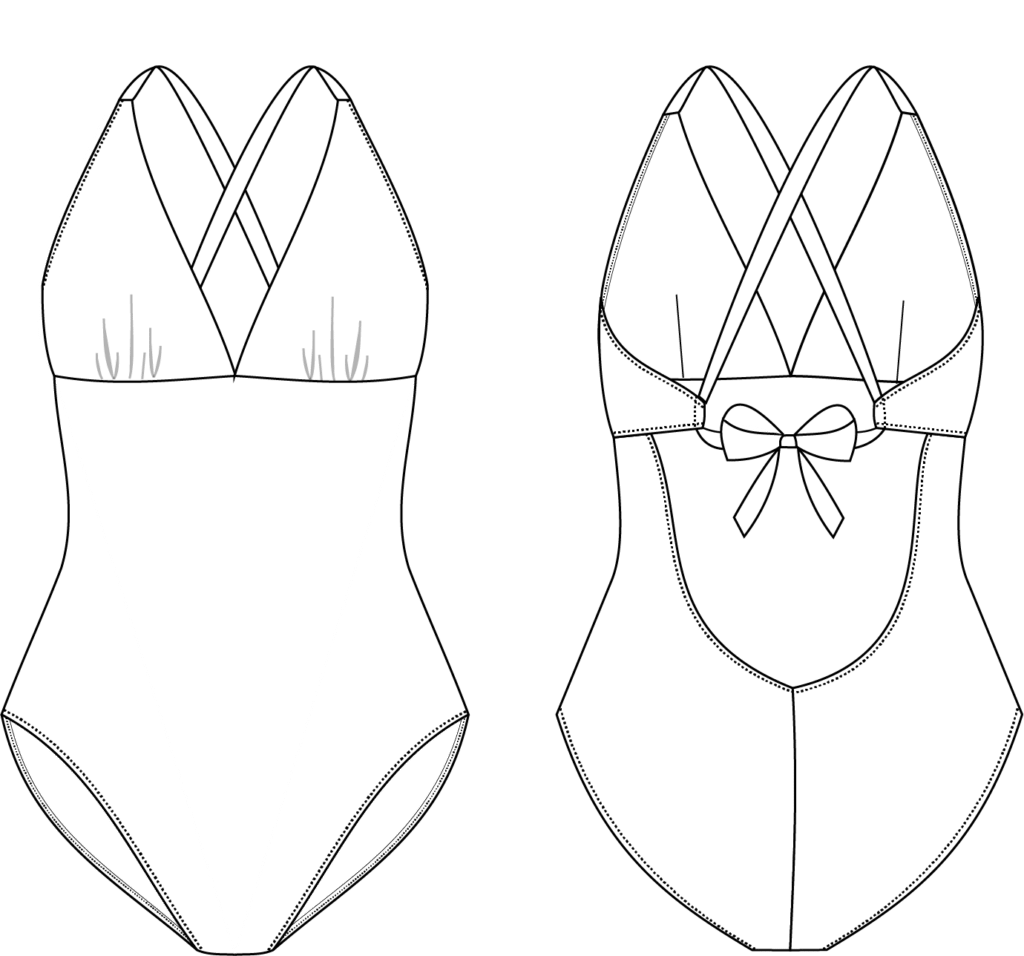L’échancrure dans le dos est mise en valeur grâce au jeu de croisement des bretelles. Ces liens sont pensés pour s’adapter à différentes morphologies et permettre un ajustement optimal lors de l’essayage (sans ajustement couture particulier). Les bretelles ont pour vocation à se porter croisé dans le dos mais la version sans croisement est possible pour varier les styles et le bronzage.