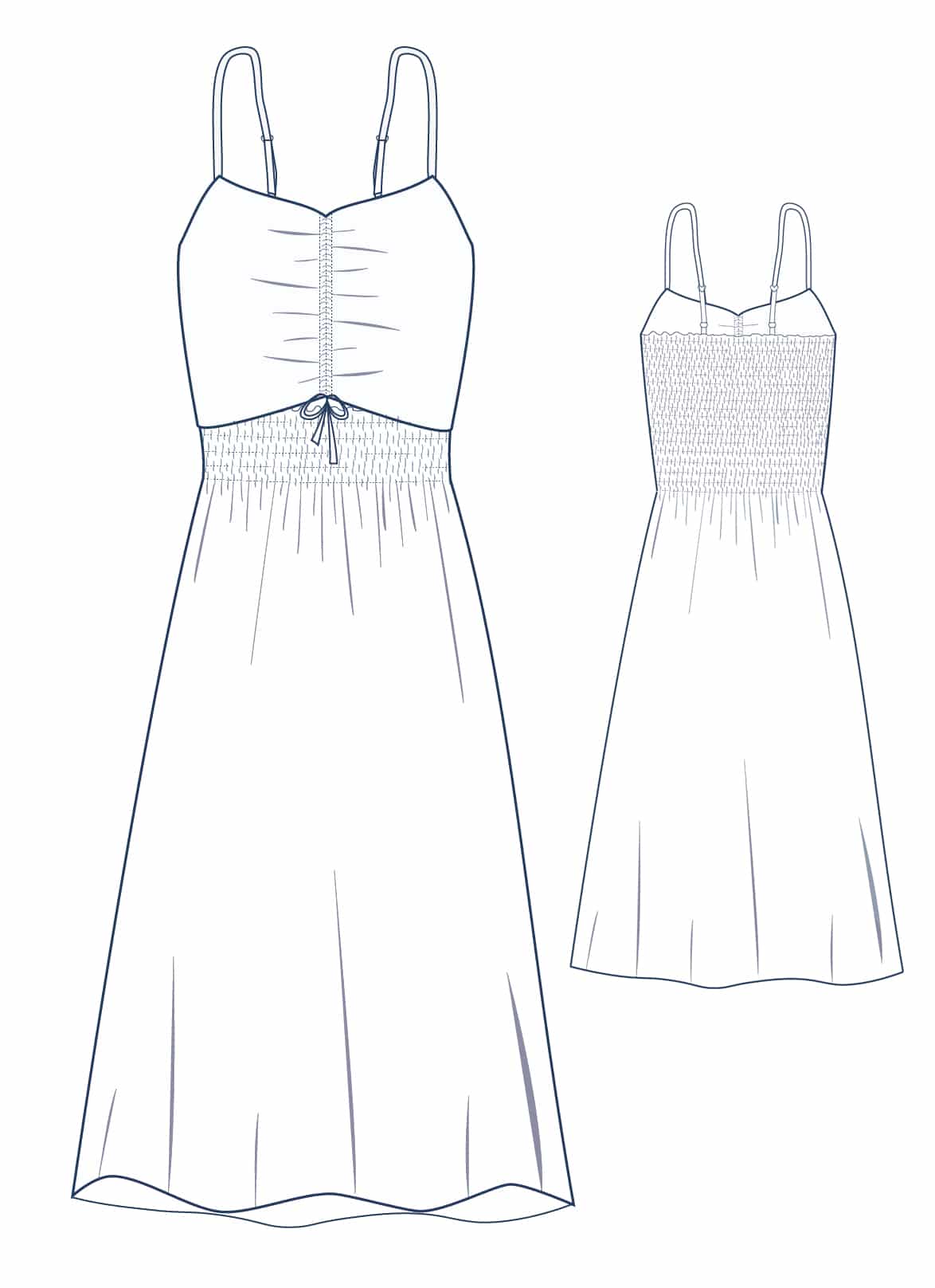Poleen est une jolie robe estivale à fines bretelles et encolure en V. L’empiècement sur le devant peut être plus ou moins relevé pour mettre en valeur une large ceinture smockée.