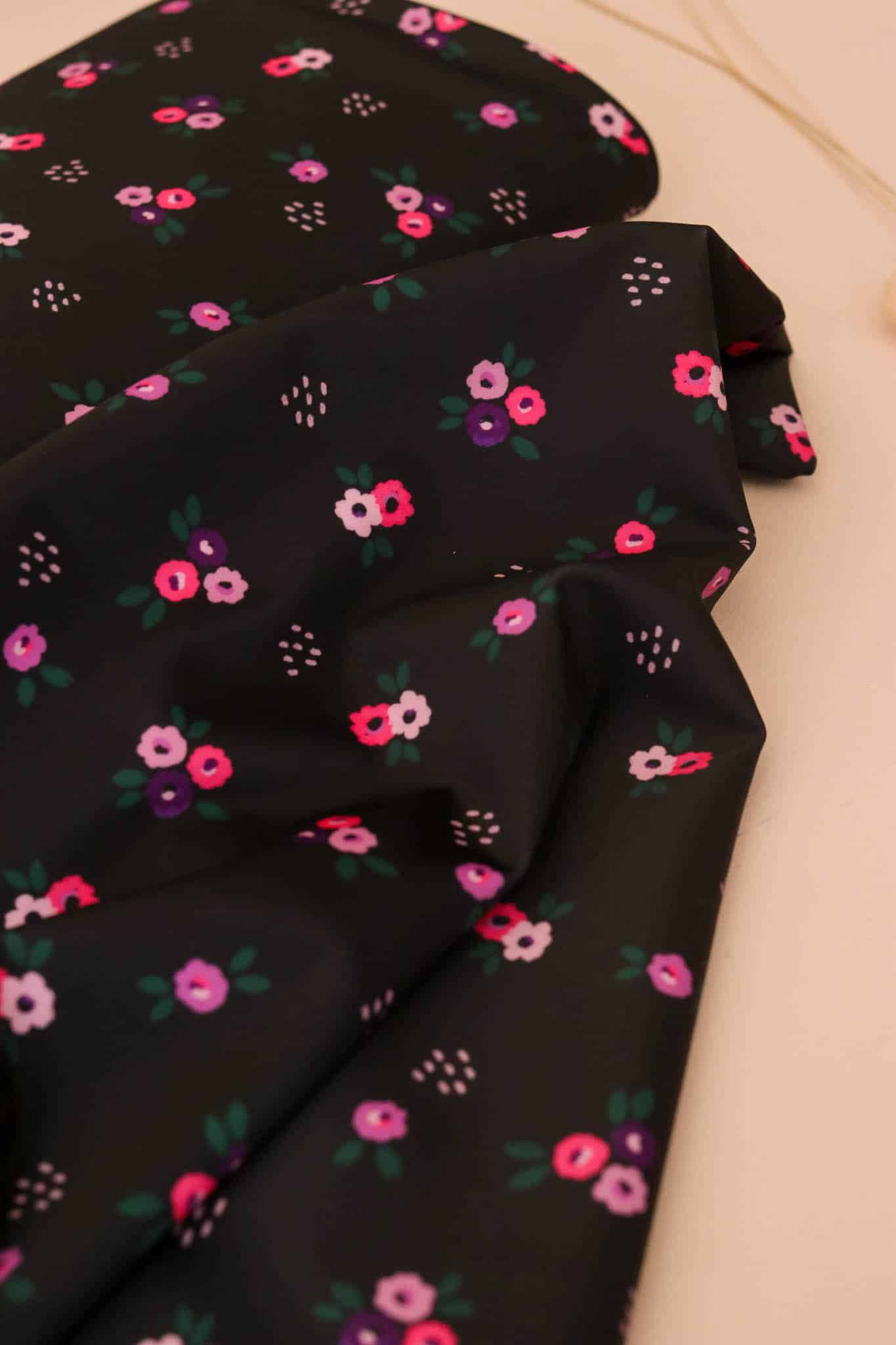 Notre motif Rêverie que vous avez adoré cet hiver revient cet été pour vous accompagner à la plage ou à la piscine. Sur un fond noir inntense, ses fleurs sont plus grosses et rapprochées que dans sa version viscose de l’hiver.