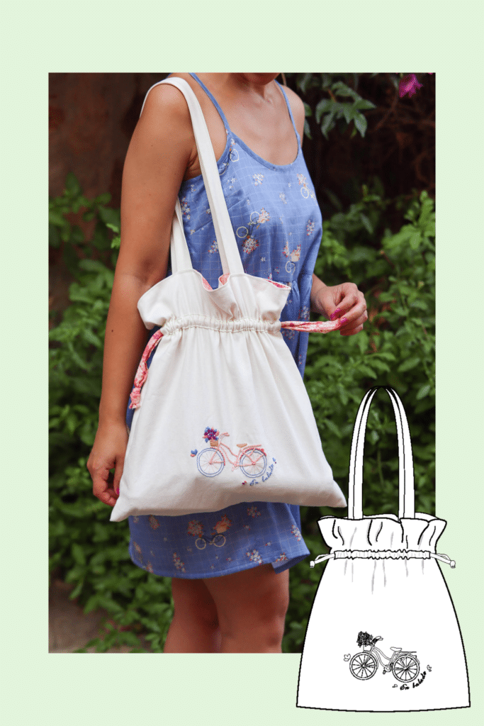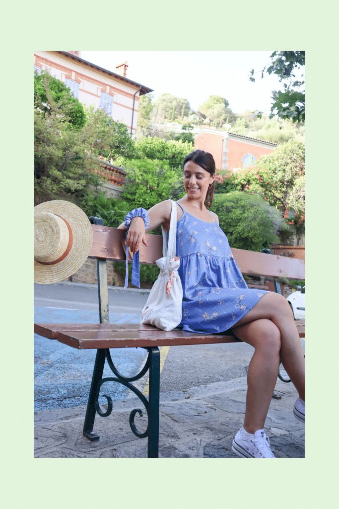 Avec une jolie robe légère, on arpente les rues en quête de souvenirs que l’on glisse dans notre tote bag chéri, celui qu’on a brodé ! Le foulchie qui relève nos cheveux est parfait pour cette journée d’excursion.