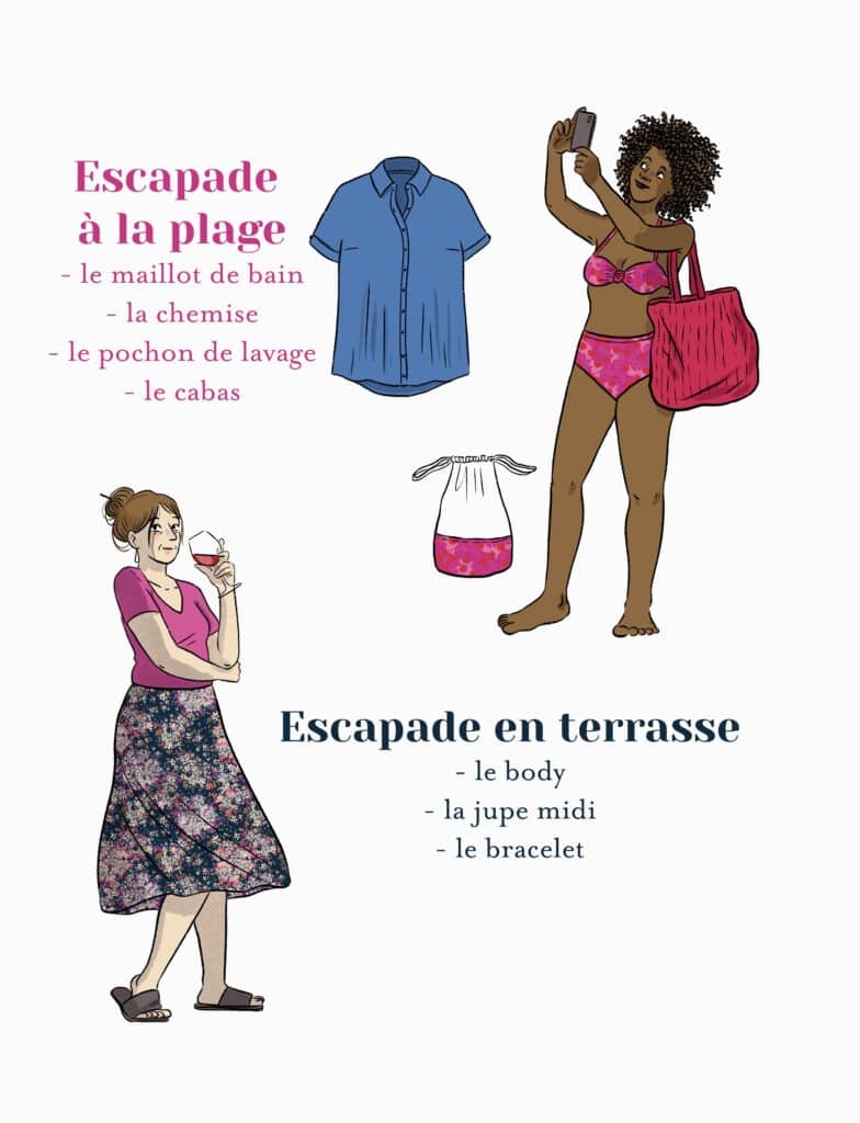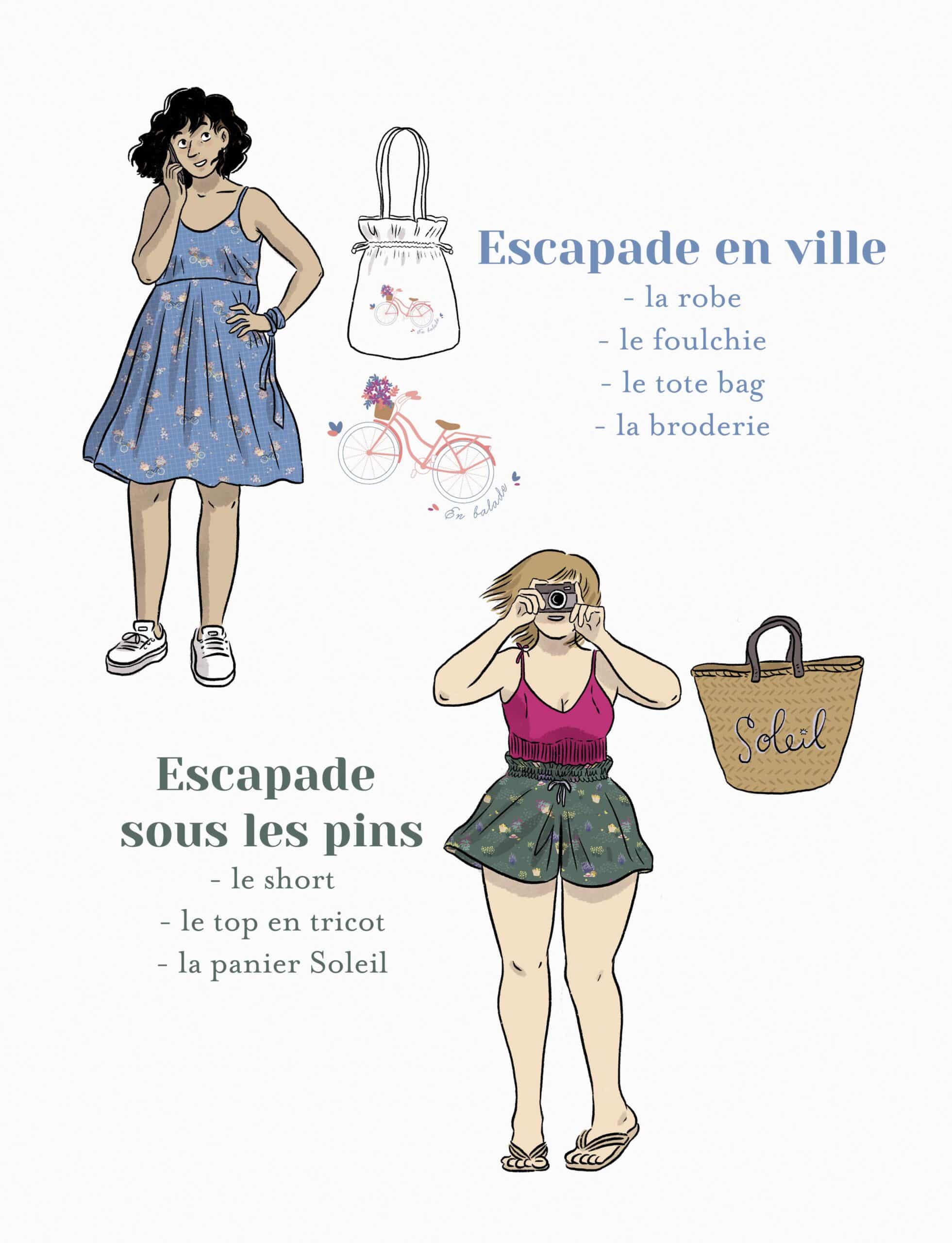 Parcourez les chapitres de Escapade au Soleil et travaillez différentes matières : de la viscose, du canvas, un fil Mérinos-soie, du lycra maillot de bain, du jersey et du satin de coton.