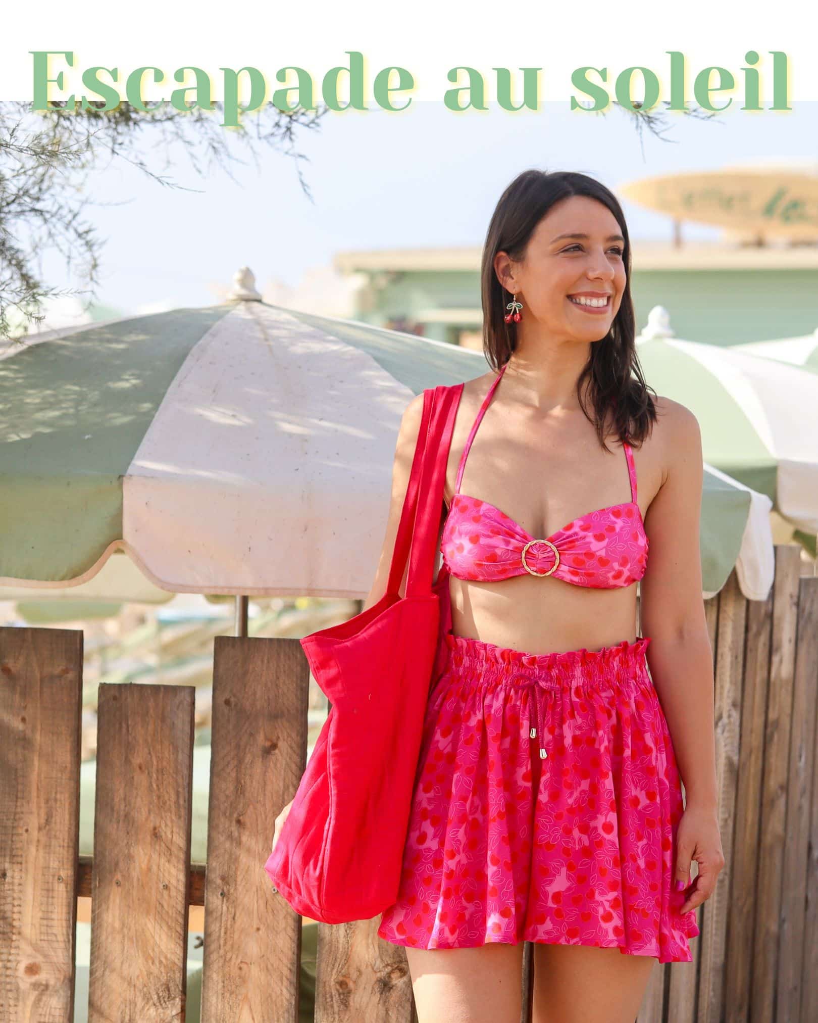 Le chant des cigales invitent à se prélasser à l’ombre des pins. Pour ce moment au ralenti, on choisit le short en viscose. Avec son ampleur, il se ferait presque passer pour une jupe. On associe ce joli volume à un top en maille près du corps. Complétons ce look avec un grand panier en l’honneur de celui qui rythme nos journée, le soleil !