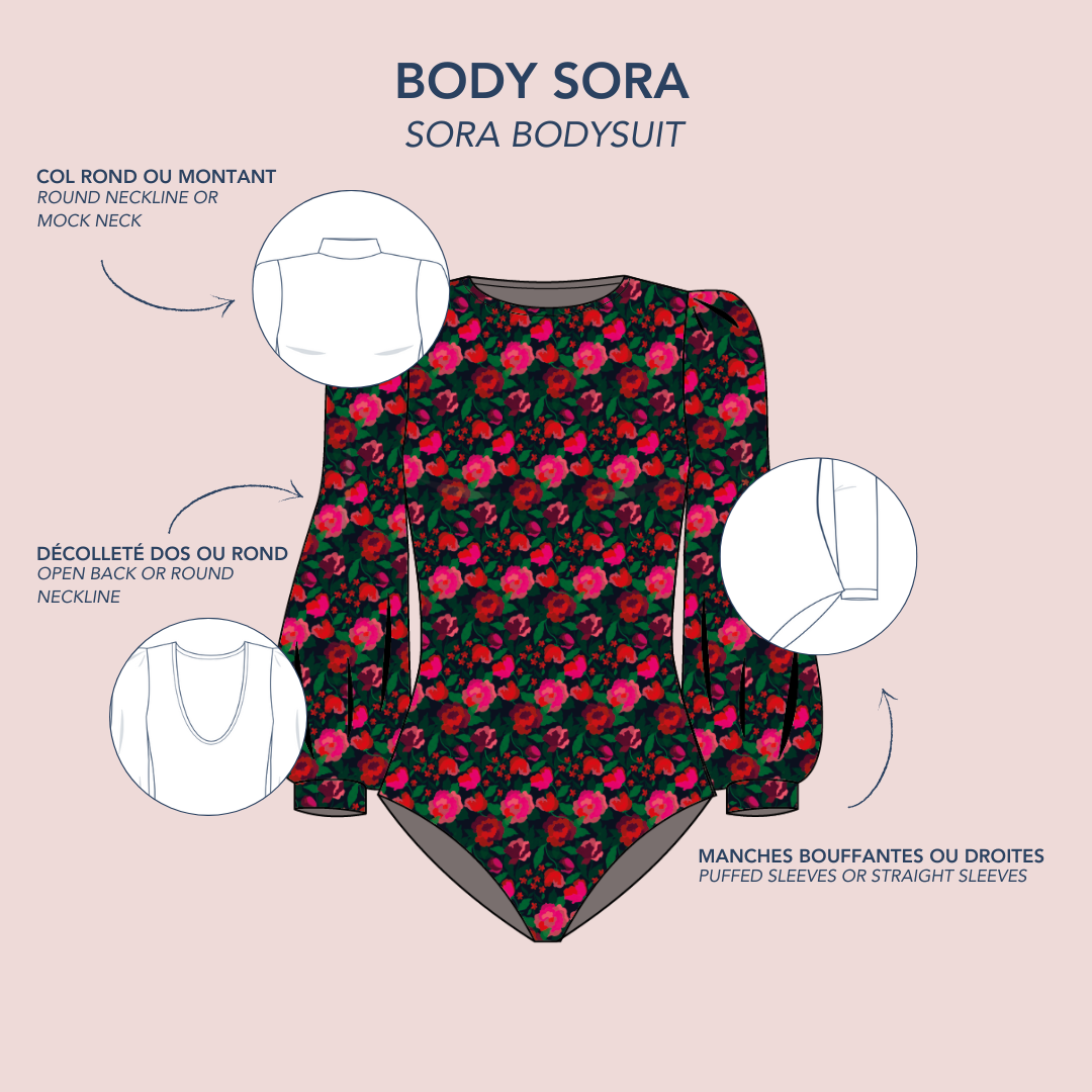 Sora est un essentiel du vestiaire féminin, à coudre et à aimer toute l’année. Avec ses trois encolures (col montant, rond ou décolleté dos) et ses deux manches (droites ou bouffantes), ce body s’adapte à toutes vos envies. Confortable, élégant et facile à porter, il se glisse aussi bien sous un pantalon que sous notre robe chasuble. Un patron versatile pour des looks du quotidien.