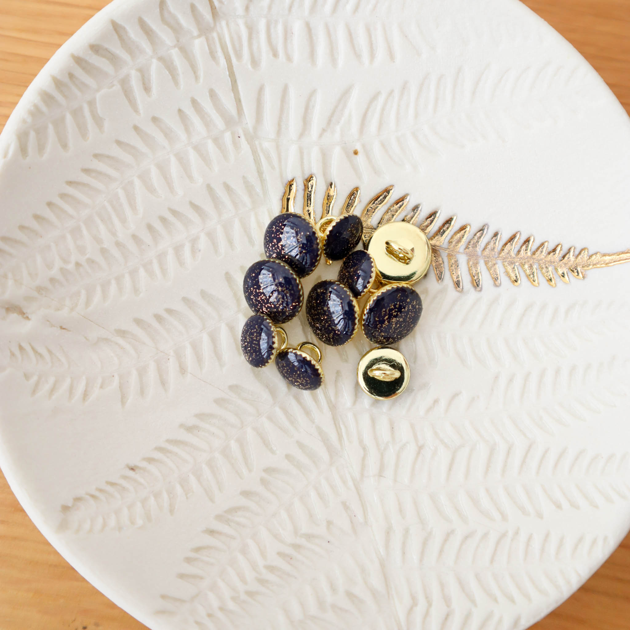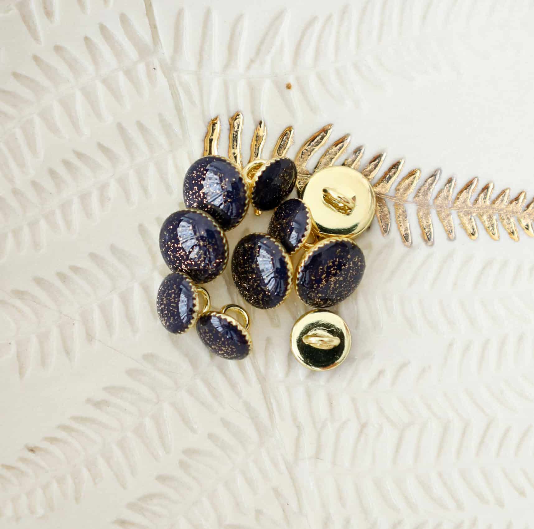 Bouton de bottine colorés et ornés de paillettes dorées. Vendu à l’unité.