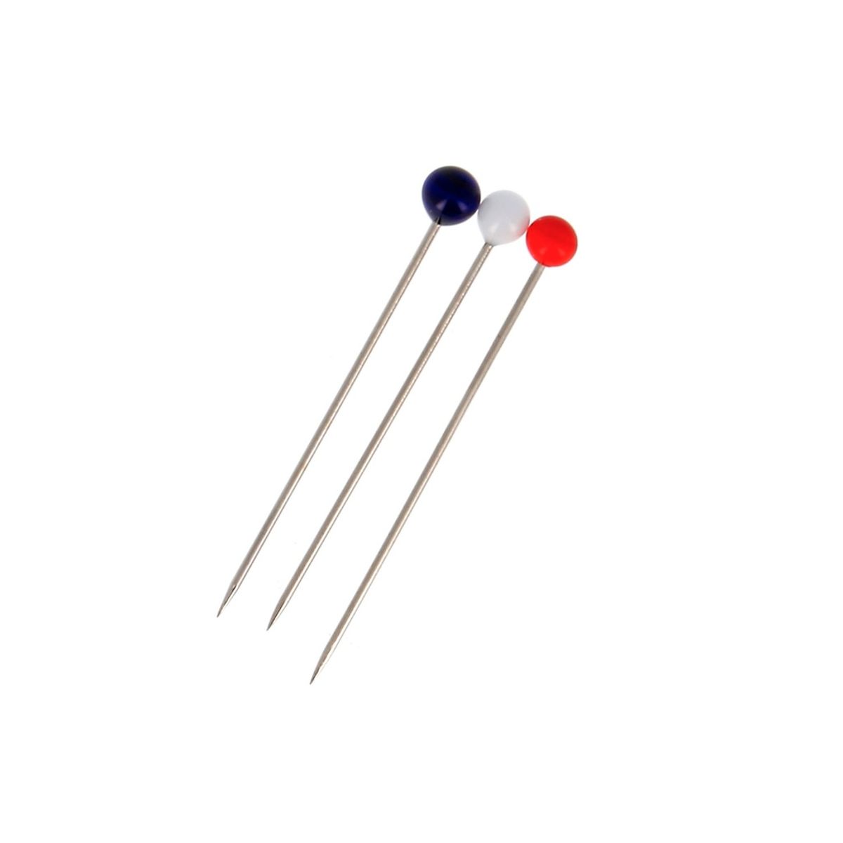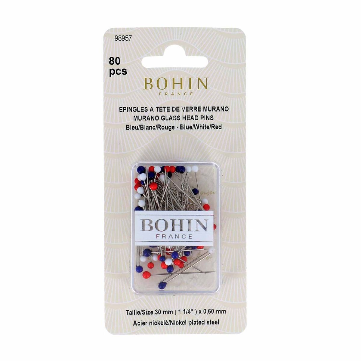 Boite de 80 épingles avec tête de verre Murano bleu, blanc ou rouge résistantes à la chaleur.