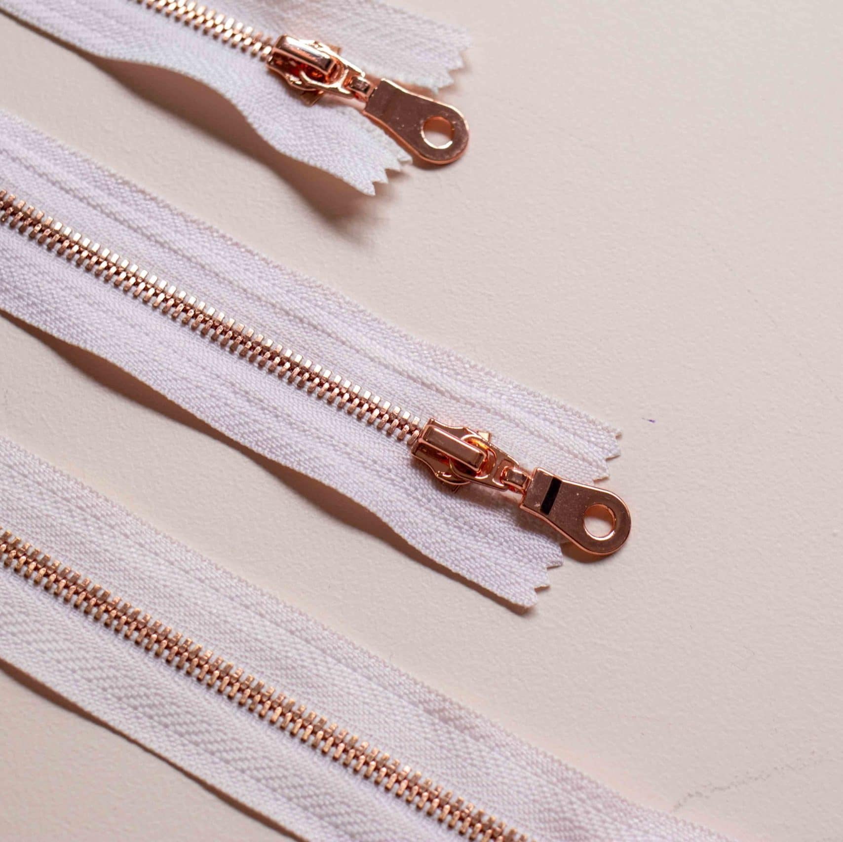 Voici de jolies fermetures à glissière or rose parfaites pour la confection de vêtements, d’objets de déco, de sacs, ou d’accessoires.