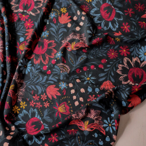 Matriochka – Notre motif iconique – Un bouquet foisonnant aux teintes poudrées et profondes sur fond noir, comme une étreinte florale chaleureuse dans la douceur de l’hiver.