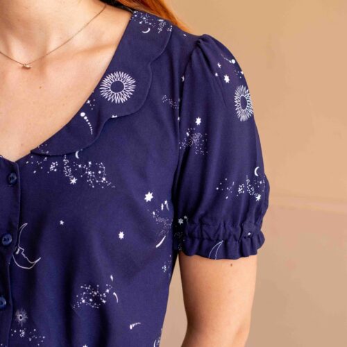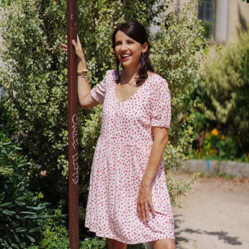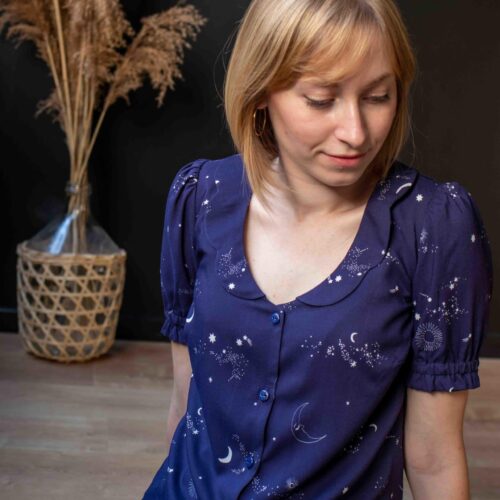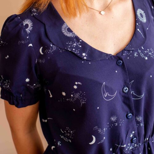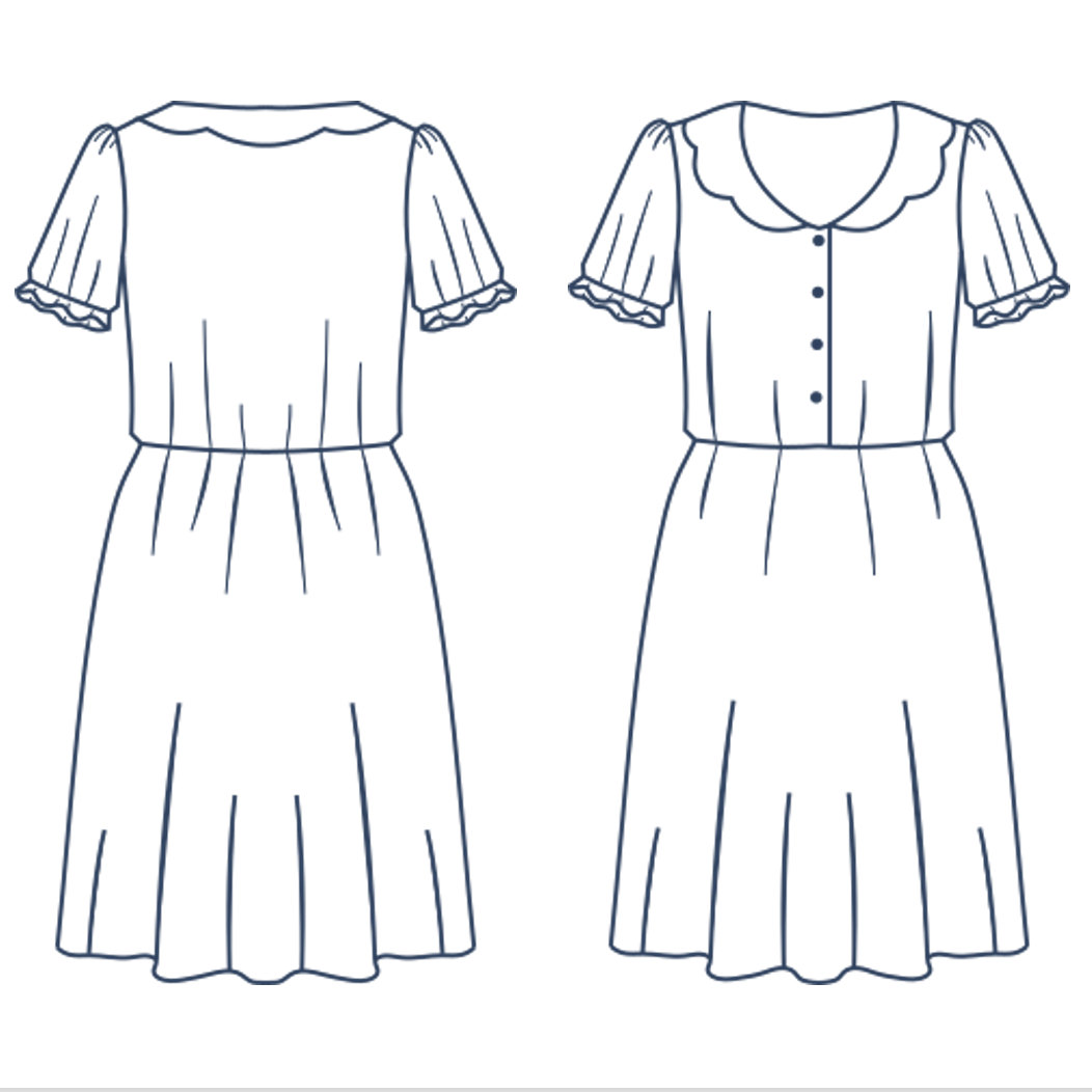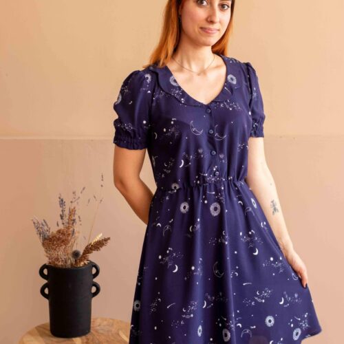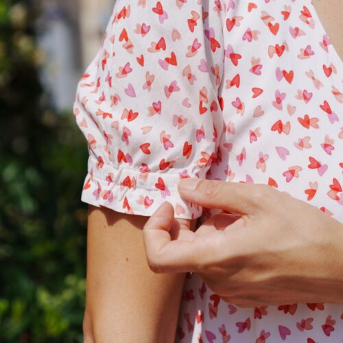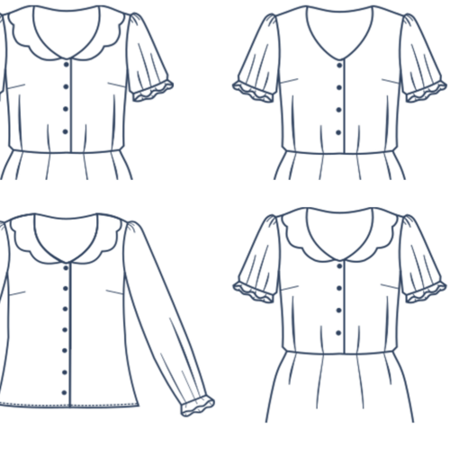 Une robe délicate et raffinée. Boutonnée devant, élastiquée à la taille et dotée d’un col festonné, le patron propose 2 versions de manches ainsi qu’une version blouse.