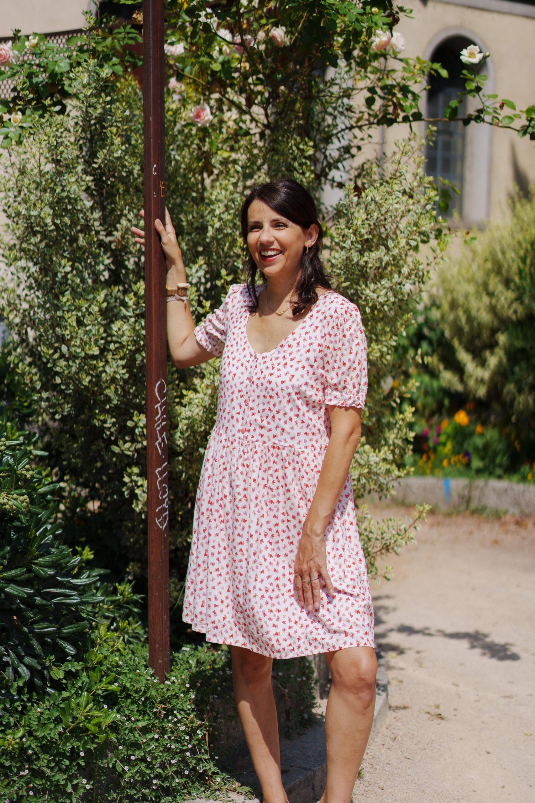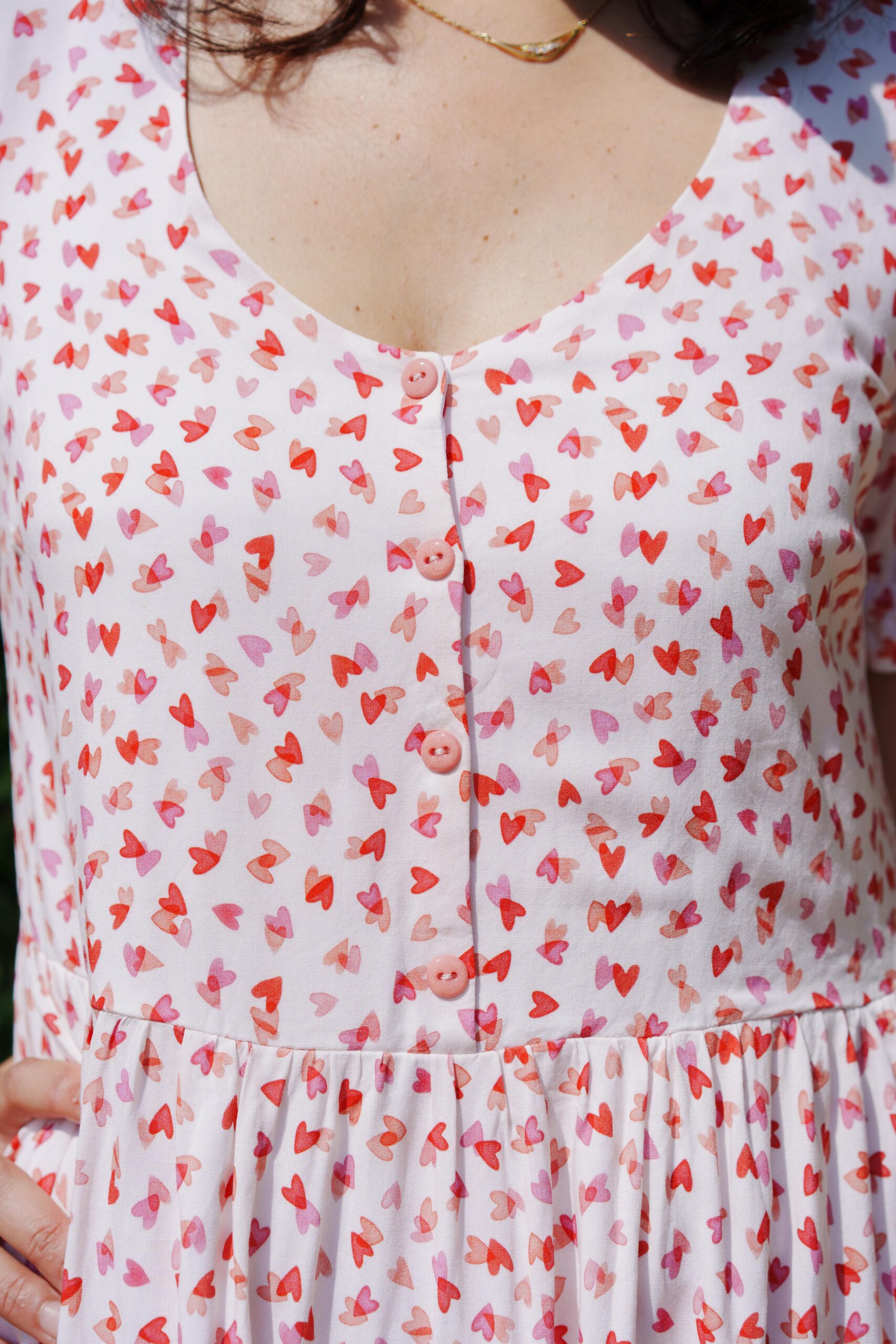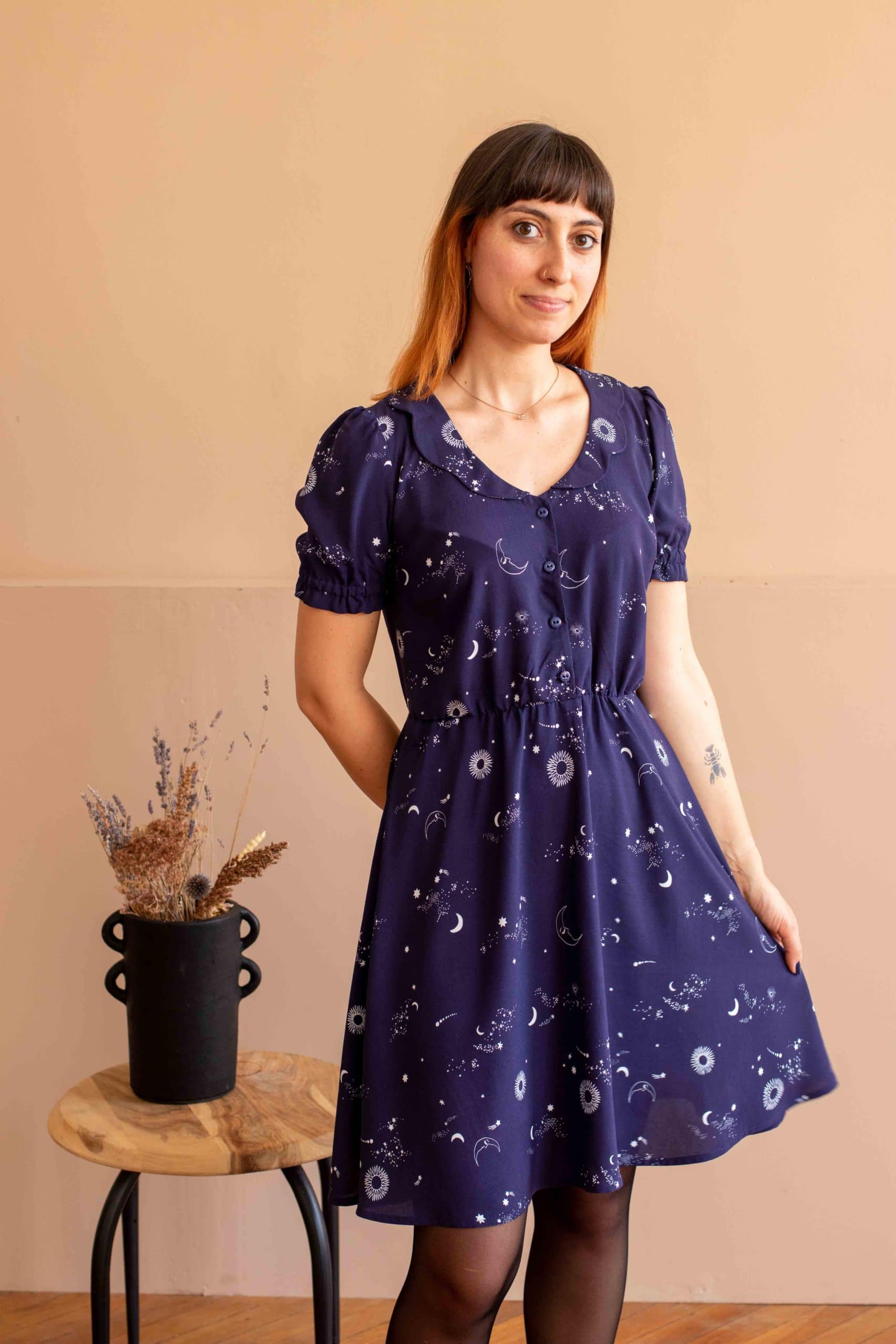 Une robe délicate et raffinée. Boutonnée devant, élastiquée à la taille et dotée d’un col festonné, le patron propose 2 versions de manches ainsi qu’une version blouse.