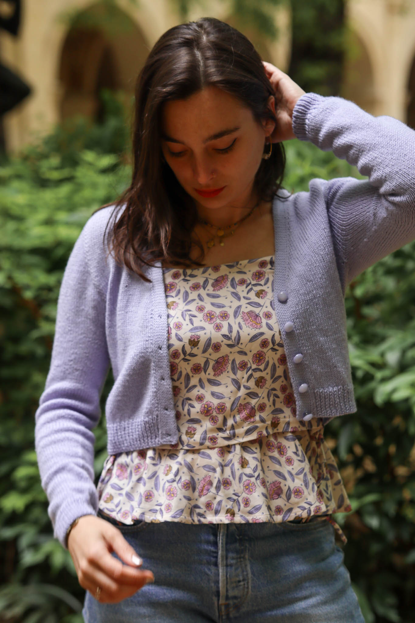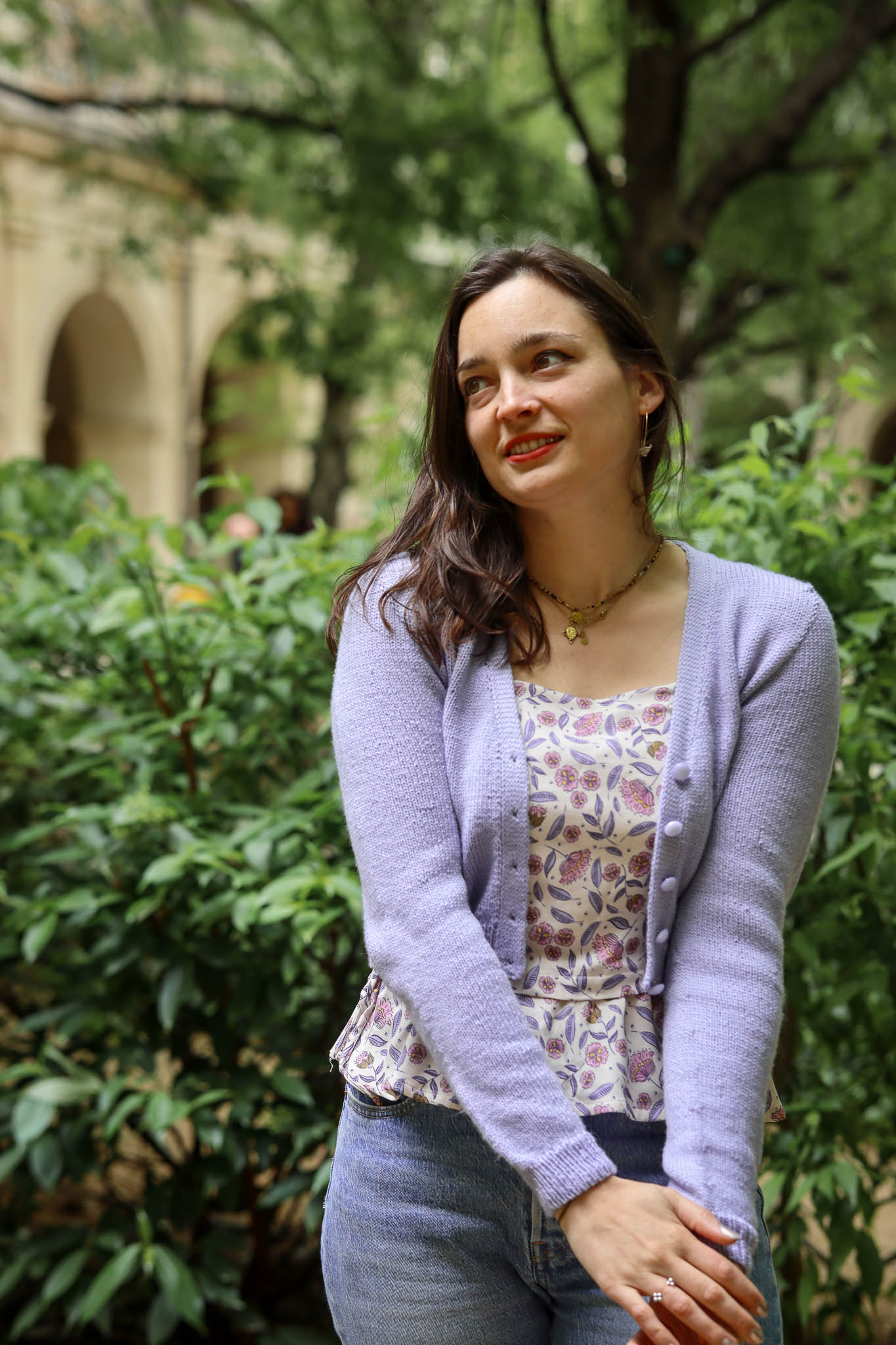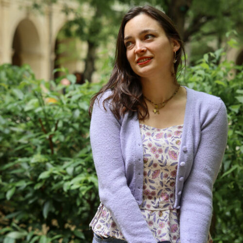 Céline porte l’écharpe Alma (mélange Mérinos + Mohair & Soie)