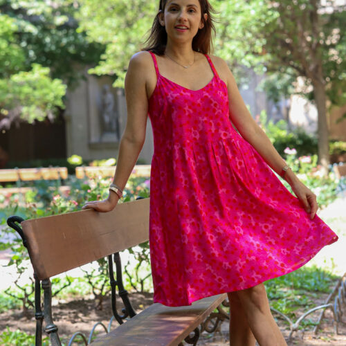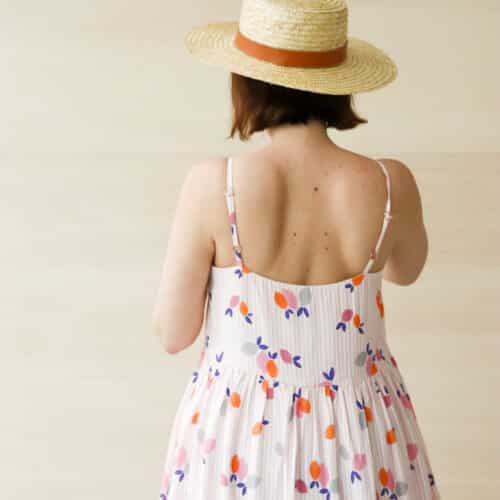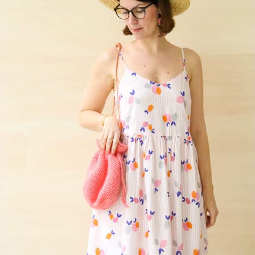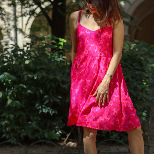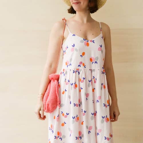 Une allure simple avec une découpe à la taille, un bas de robe froncé et un décolleté en V sur le devant, voici la petite robe idéale pour un projet rapide ou pour débuter, à décliner à l’infini !