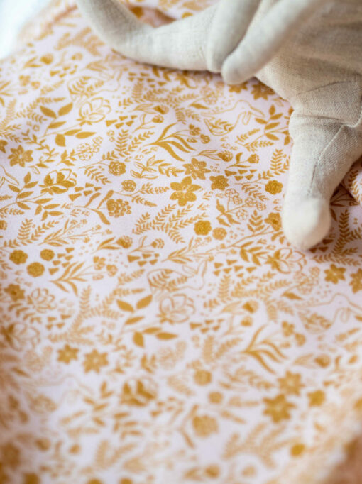 Garenne enchantée est un motif enchanteur qui raconte une histoire de nature et de découvertes. Parmi les fleurs et les feuilles, un petit lapin se cache, presque invisible à première vue. Ses oreilles pointues et son petit museau curieux émergent timidement derrière les feuillages, ajoutant une note de jeu et de mystère au motif. Ce lapin, dans les mêmes teintes d’ocre doré, semble faire partie intégrante des fleurs enchantées, un petit secret à découvrir. Le fond rose très pâle, doux et apaisant, crée une ambiance de tendresse et de sérénité. Ce motif à la dimension ludique, stimule l’imagination. Ce motif sera parfait pour une robe de petite fille qui prendra plaisir à donner vie à ses rêves. Il l’accompagnera volontiers tant dans ses jeux et découvertes que dans un cocon douillet.