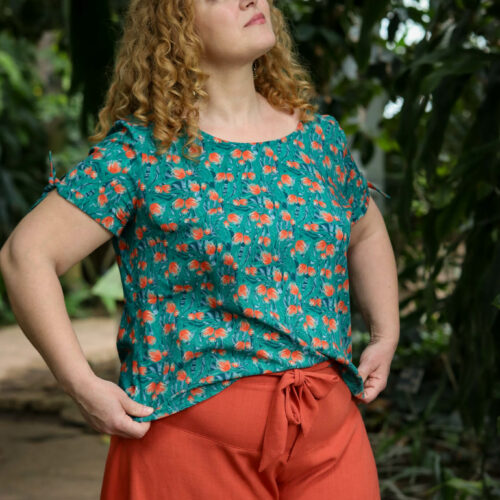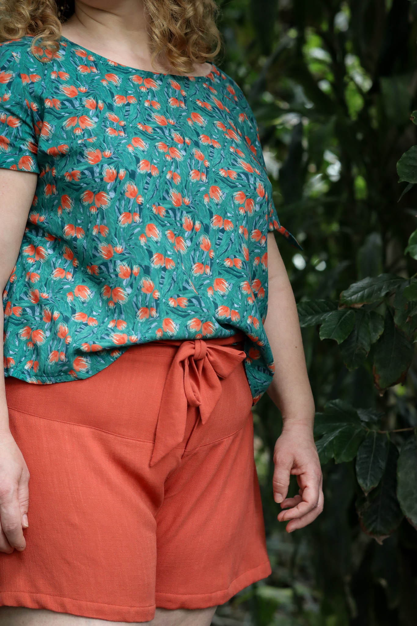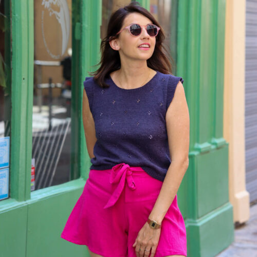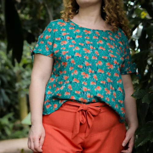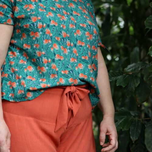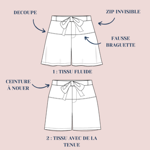 Pour réaliser ce modèle, nous vous conseillons d’utiliser un tissu avec du drapé type viscose, lin viscose pour l’option n°1. Il est également possible de le réaliser dans un tissu avec un peu plus de tenue comme une gabardine ou un velours pour l’option n°2. (Le patronage est prévu pour un tissu en chaîne et trame).