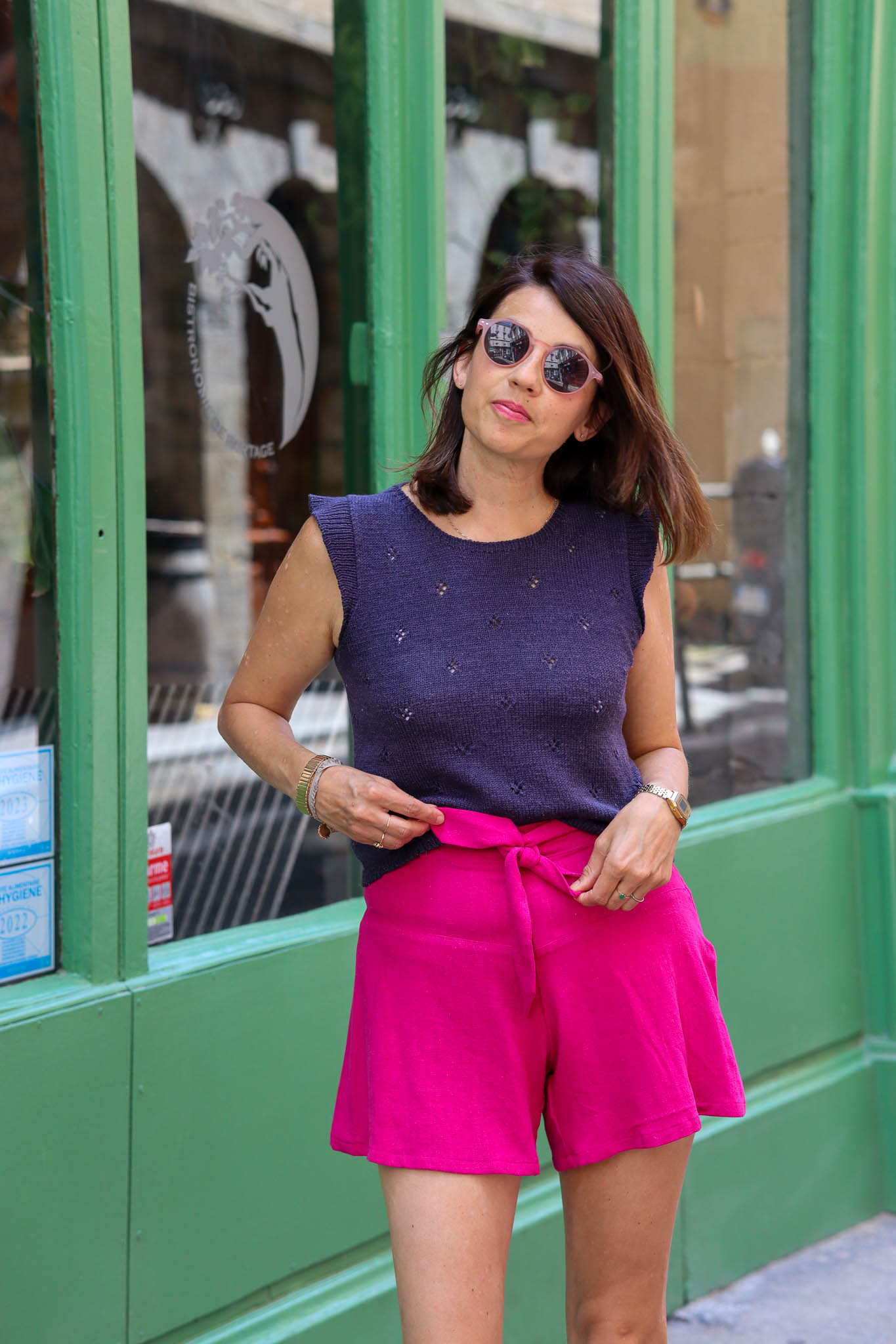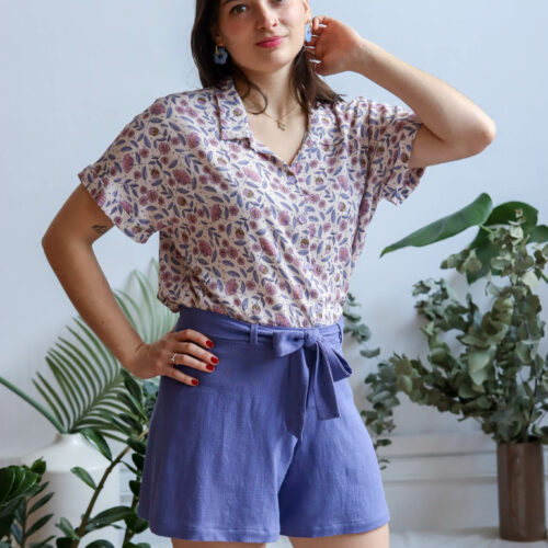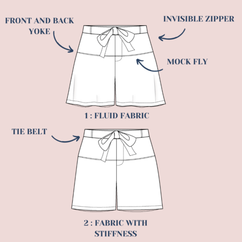 Ajusté à la taille, le short s’enfile grâce à une fermeture invisible dissimulée dans la couture côté. La découpe au niveau du bassin permet de structurer le short et de jouer avec les surpiqures tout en mettant en valeur la fausse braguette accessoirisée par une ceinture à nouer.