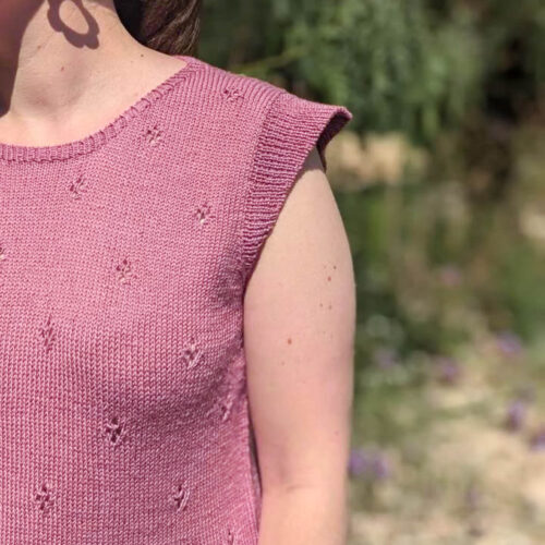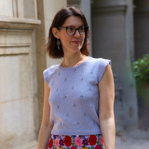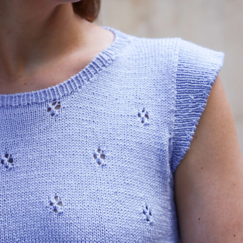 Le slipover Opale se porte au choix, comme un top pour un look printanier, ou bien en slipover pour la demi-saison. Il se tricote du bas vers le haut en rond dans un joli point ajouré losange. Nous séparons ensuite le dos et le devant pour les tricoter séparément à plat. L’encolure est créée par des rangs raccourcis pour être ensuite reprise pour créer le col. Les volants sur les épaules sont tricotés en dernier, après avoir assemblé les épaules.