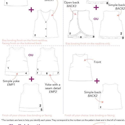 | Version DOS SIMPLE avec empiècement EMP1 et EMP2 – Tissu principal (laize 140cm) | ||||||||||