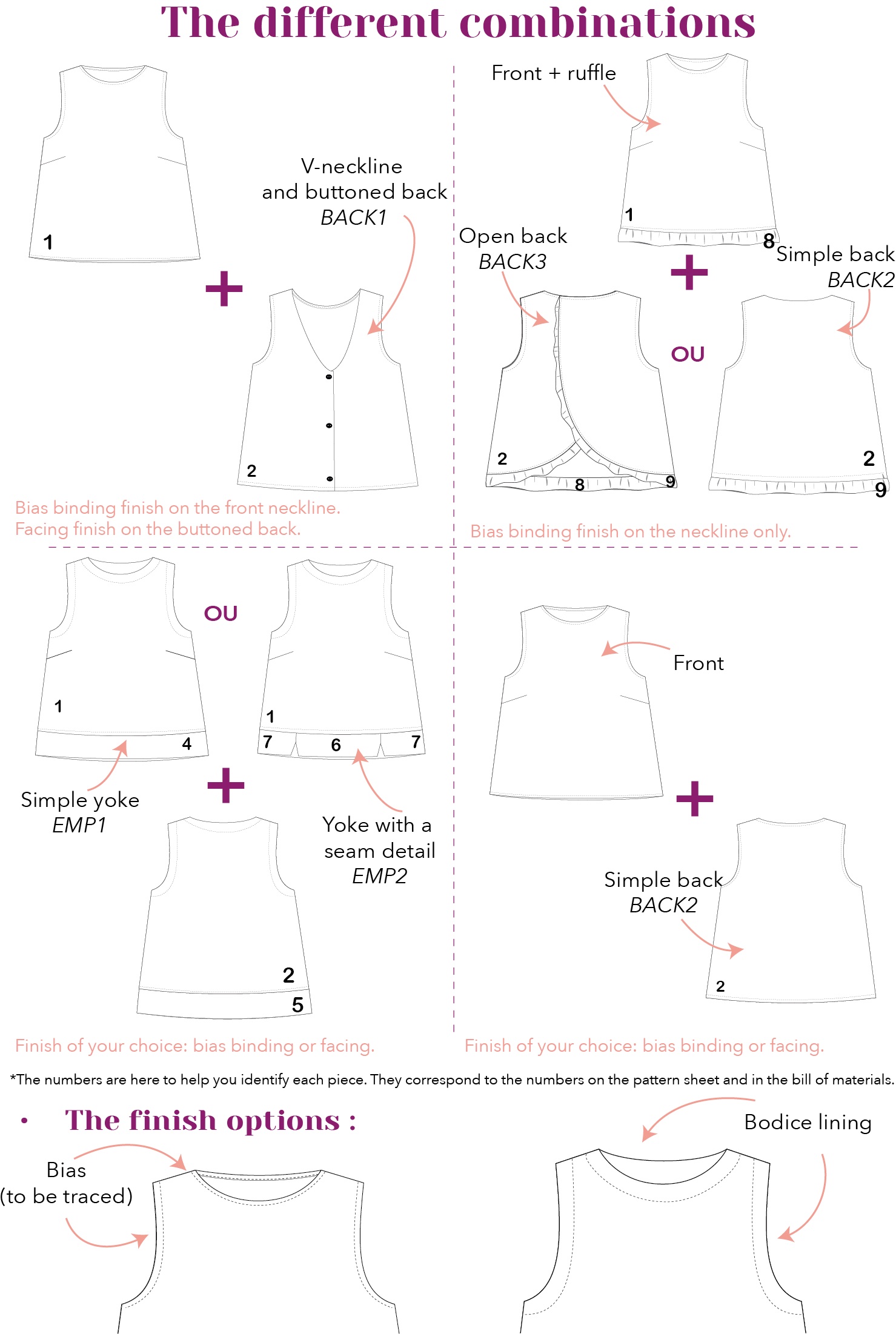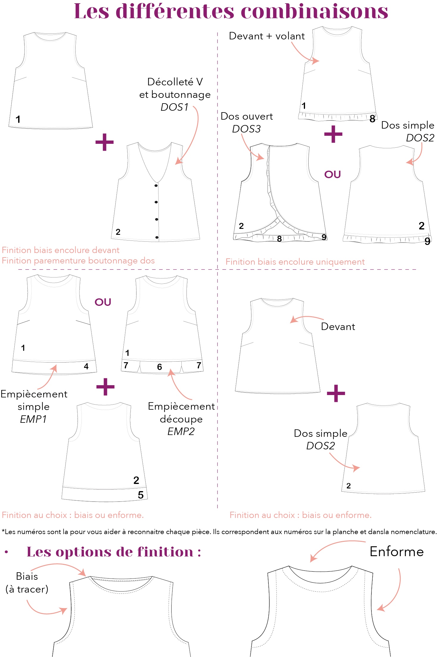 | Tissu principal (laize 140cm) | 60cm (à ajouter au métrage de l’option choisie “avec biais”) | |||||||||