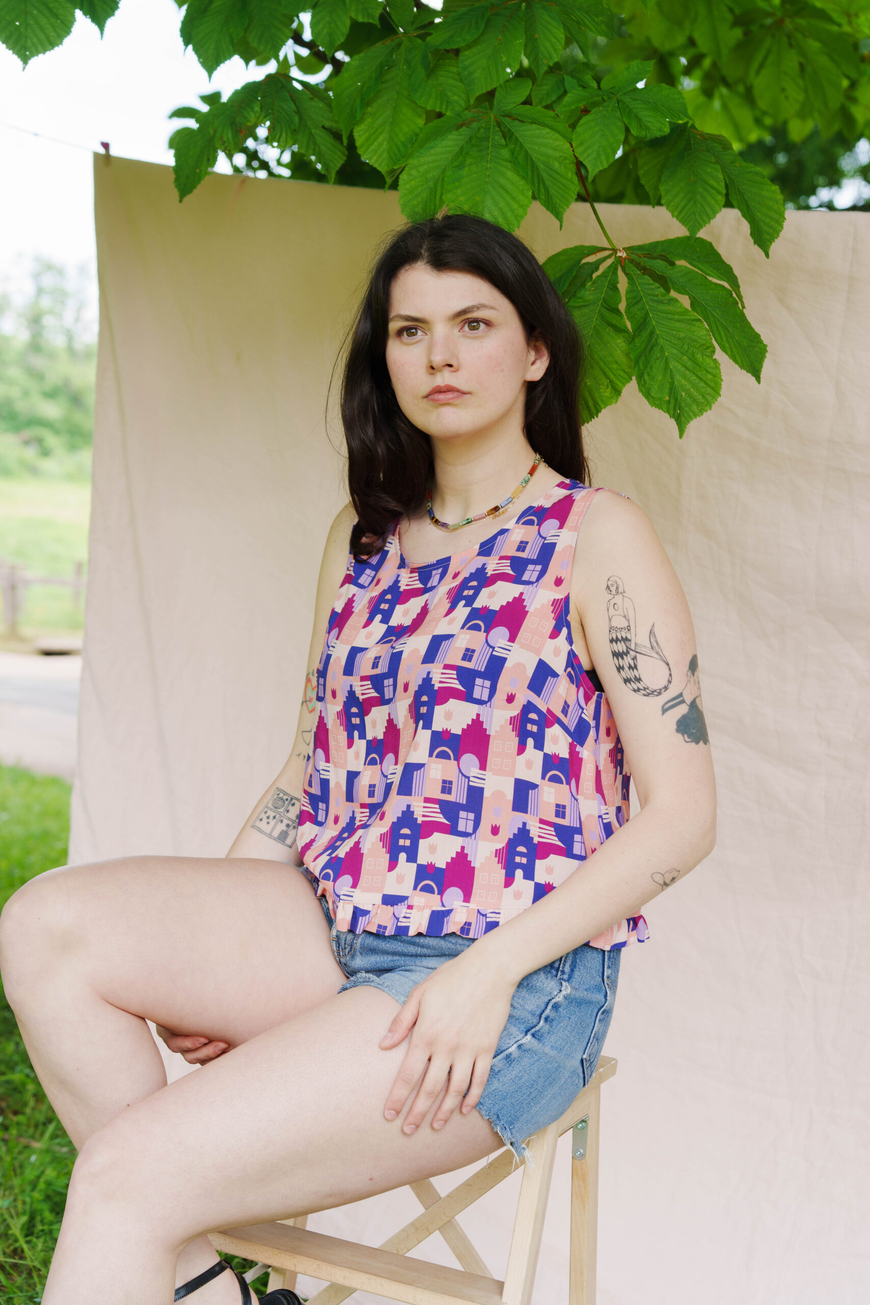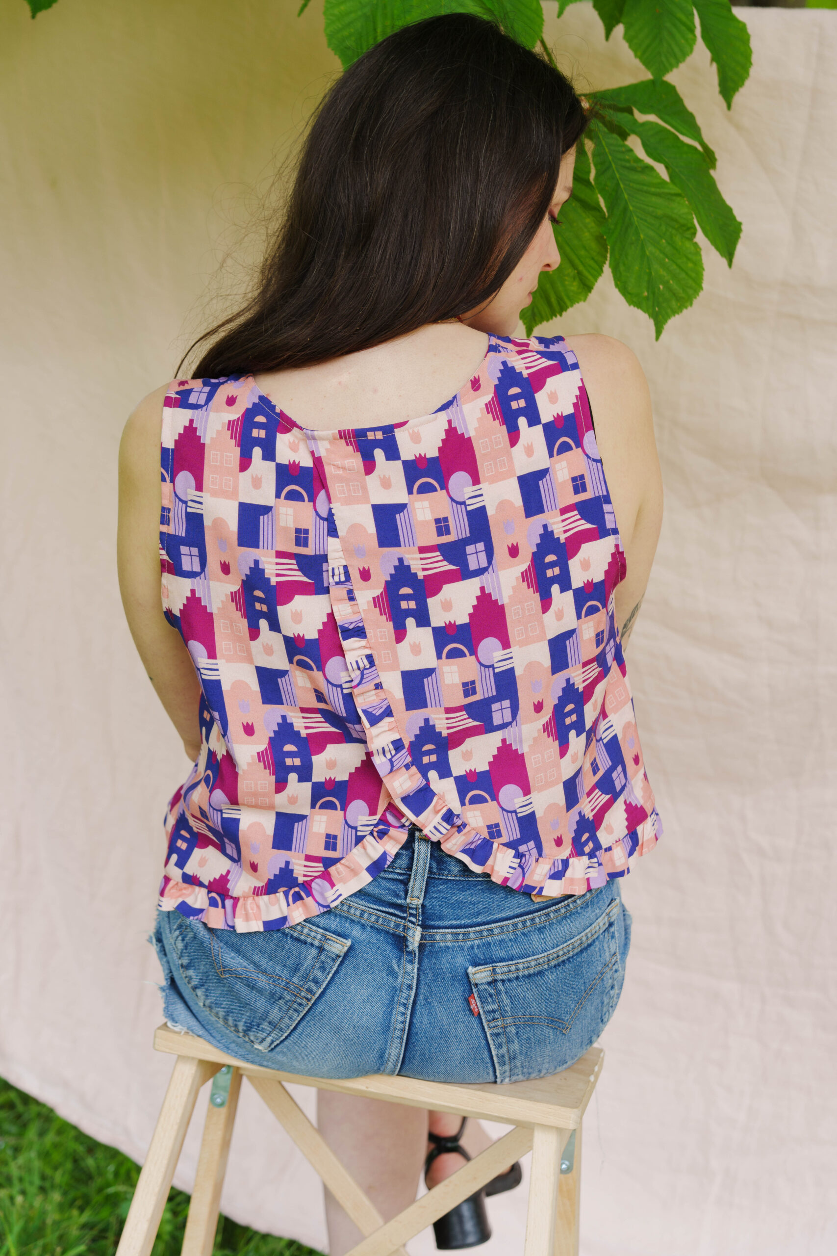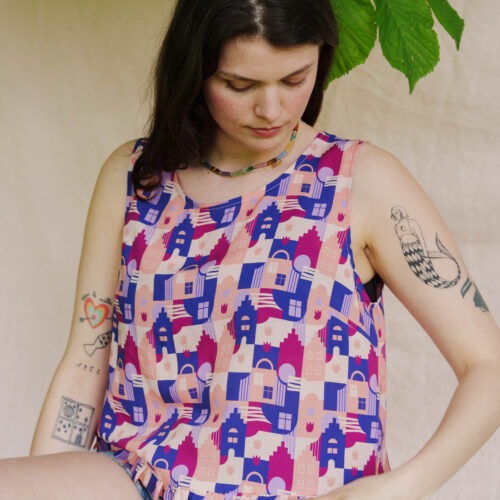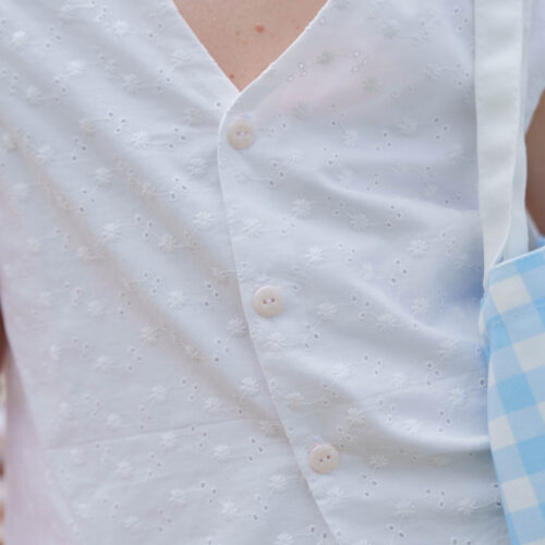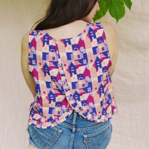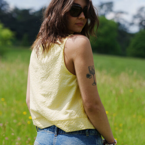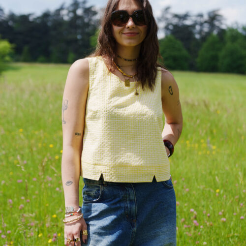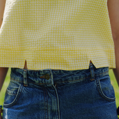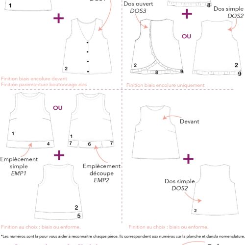 Pour réaliser ce top, nous vous conseillons d’utiliser un tissu fin type viscose, satin de coton, lin viscose… Il peut également être réalisé dans un tissu avec plus de tenue comme une gabardine ou un denim. (Le patronage est prévu pour un tissu en chaîne et trame).